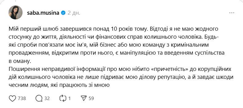 Любые попытки связать мое имя, мой бизнес или мою команду с уголовным производством, открытым против него, является манипуляцией и введением общества в заблуждение. Распространение ложной информации о моей якобы "причастности" к коррупционным действиям бывшего мужа не только подрывает мою деловую репутацию, но и наносит вред честным людям, которые работают со мной,