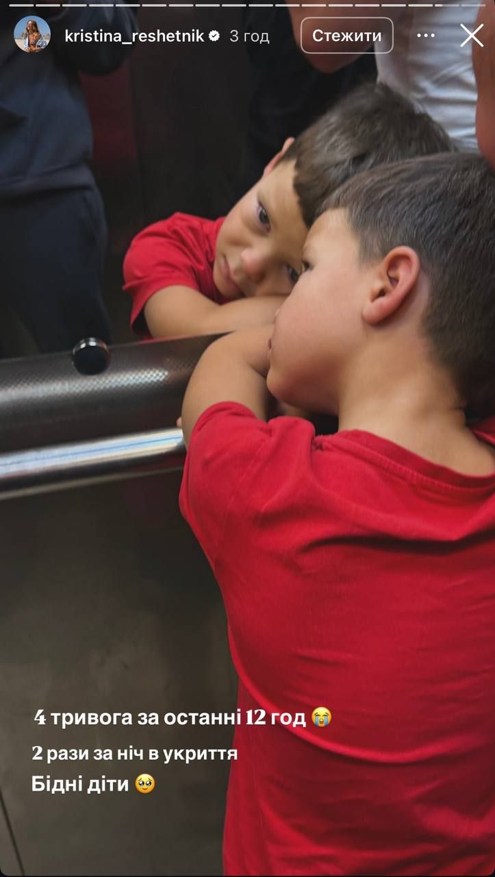 - Кристина Решетник сообщила, что за 12 часов в Киеве было 4 воздушные тревоги, 2 раза семья спускалась в укрытие.