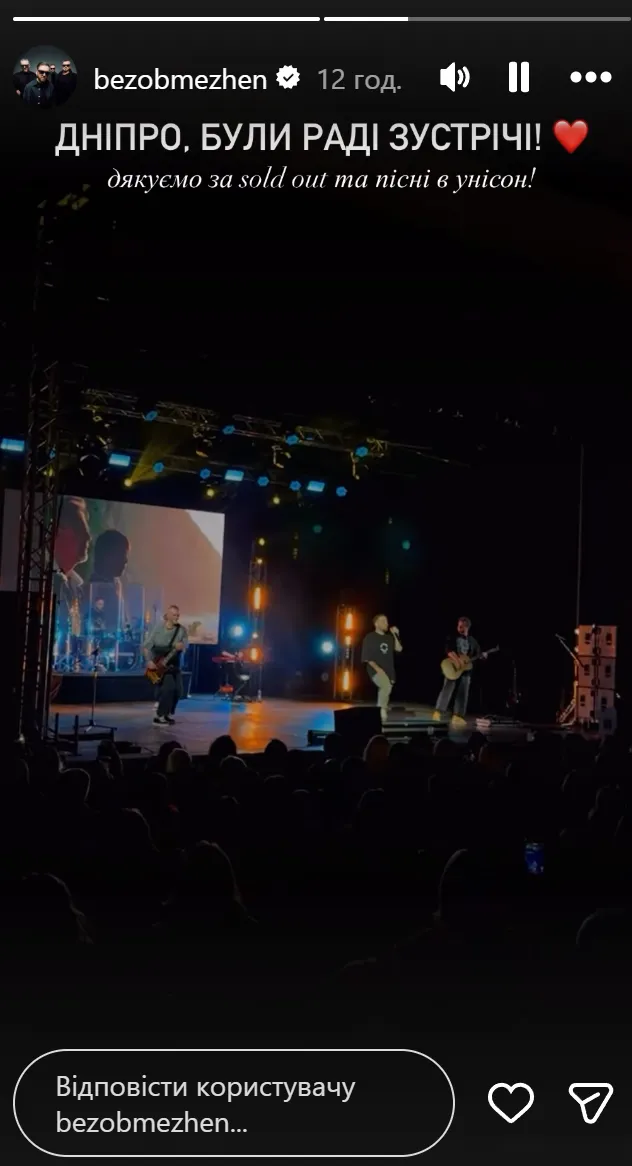 БЕЗ ОБМЕЖЕНЬ выступили в Днепре / Скриншот из инстаграм-сторис