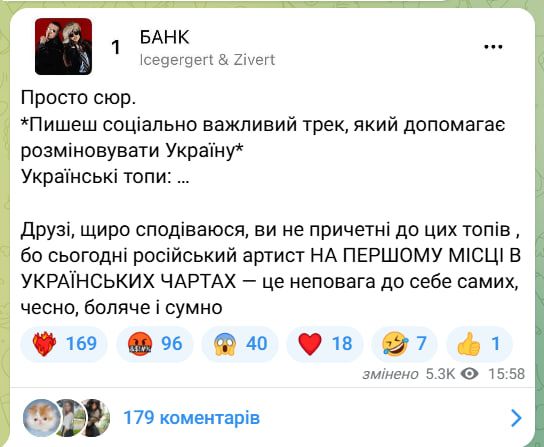 Просто сюр. Пишешь социально важный трек, который помогает разминировать Украину. Украинские топы... Друзья, искренне надеюсь, что вы не причастны к этим топам, потому что сегодня российский артист на первом месте в украинских чартах – это неуважение к самим себе, честно, больно и грустно,