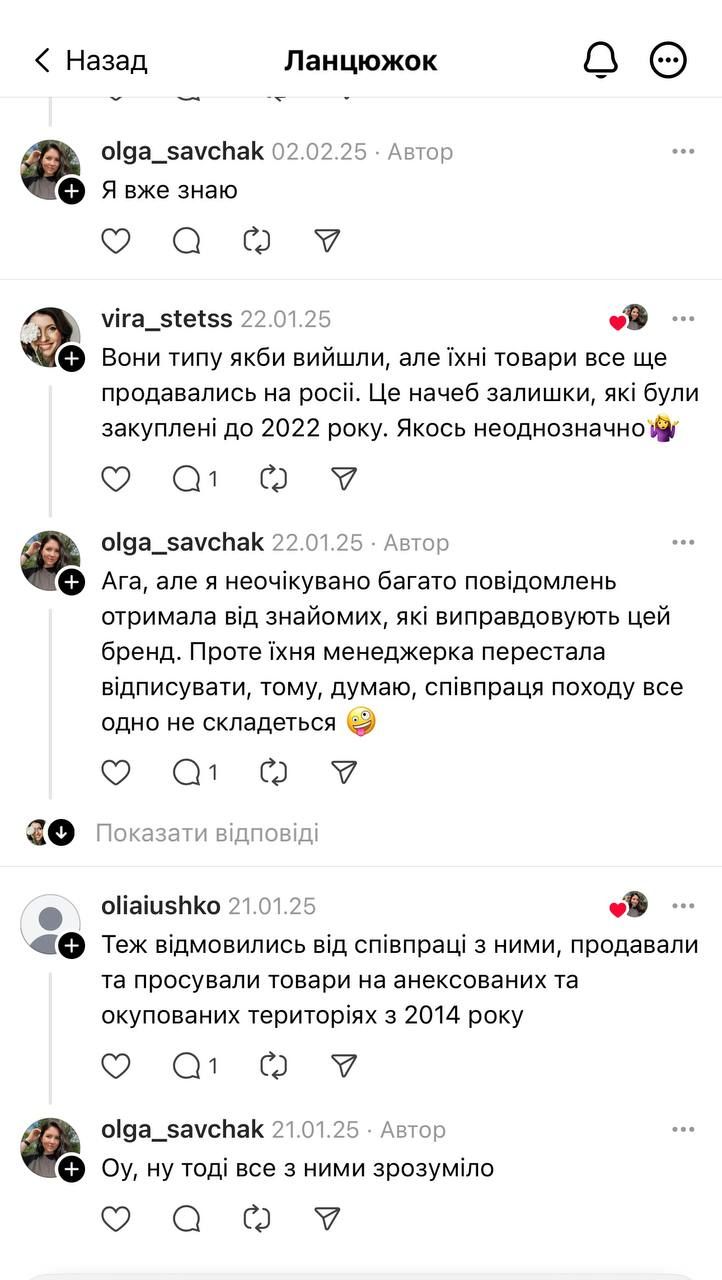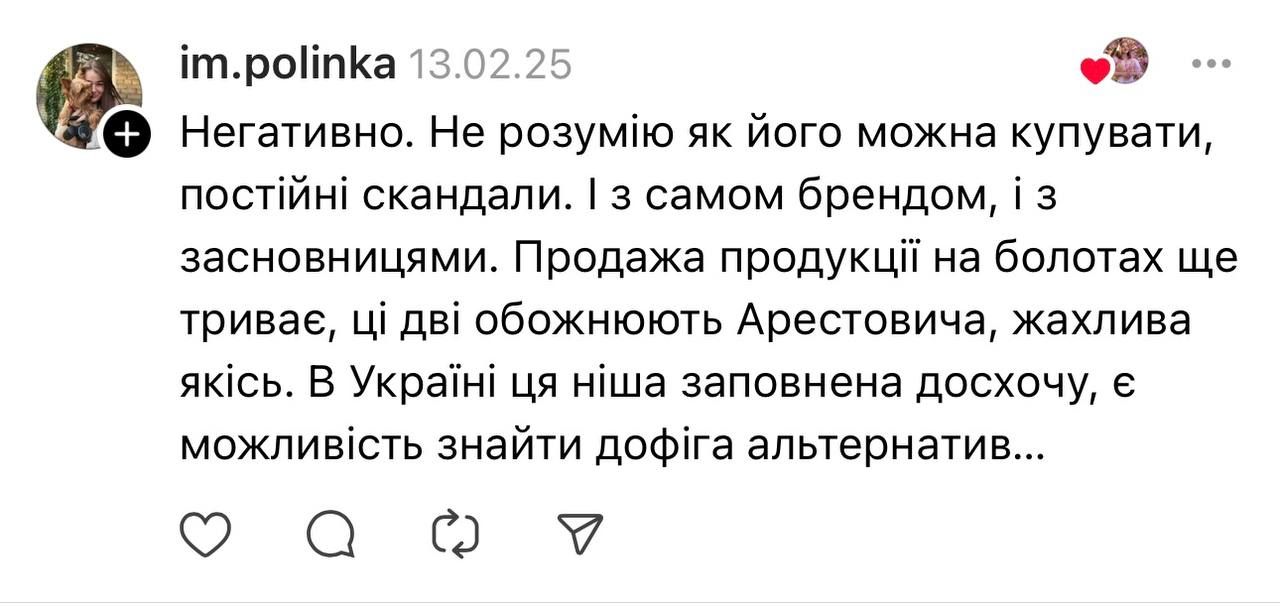 - "Не понимаю, как его можно покупать, постоянные скандалы. И с самим брендом, и с основательницами. Продажа продукции на болотах еще продолжается, эти две обожают Арестовича, ужасное качество".