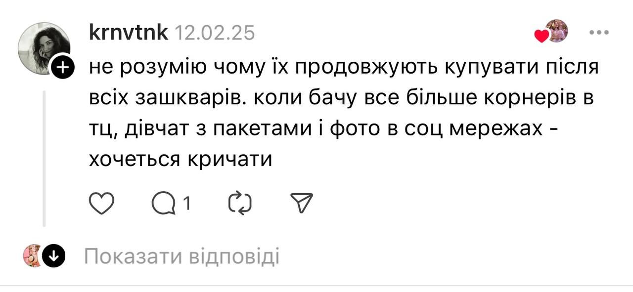 - "Не понимаю, почему их продолжают покупать после всех зашкваров. Когда вижу все больше корнеров в ТЦ, девушек с пакетами и фото в соцсетях – хочется кричать".