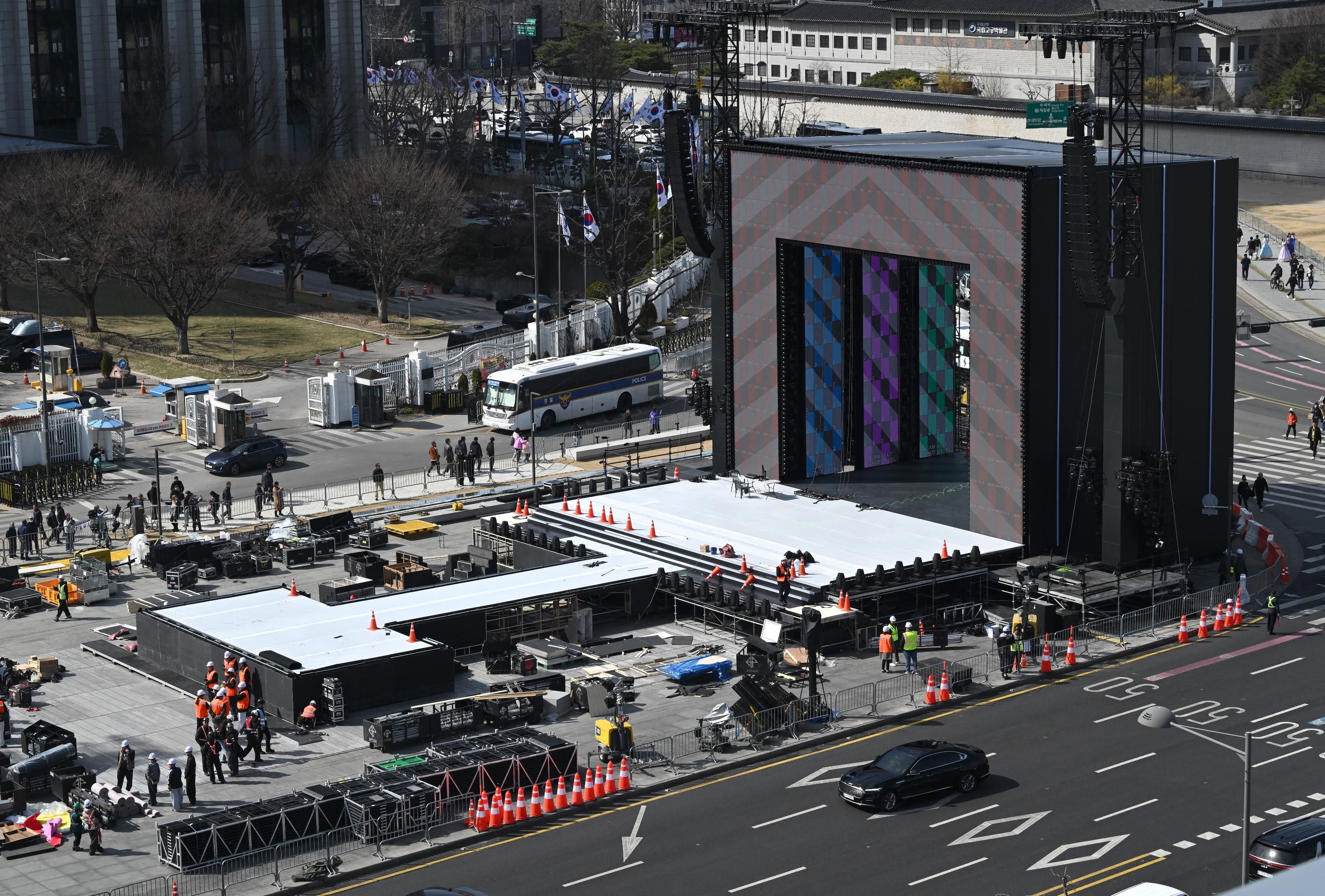 Власти подсвечивают достопримечательности, красят часть Сеула в фирменный цвет группы – фиолетовый и разворачивают около 7000 полицейских, в частности спецподразделения, оснащены системами защиты от дронов, чтобы следить за толпой на площади. Доступ к десяткам зданий будет ограничен, три станции метро будут закрыты.