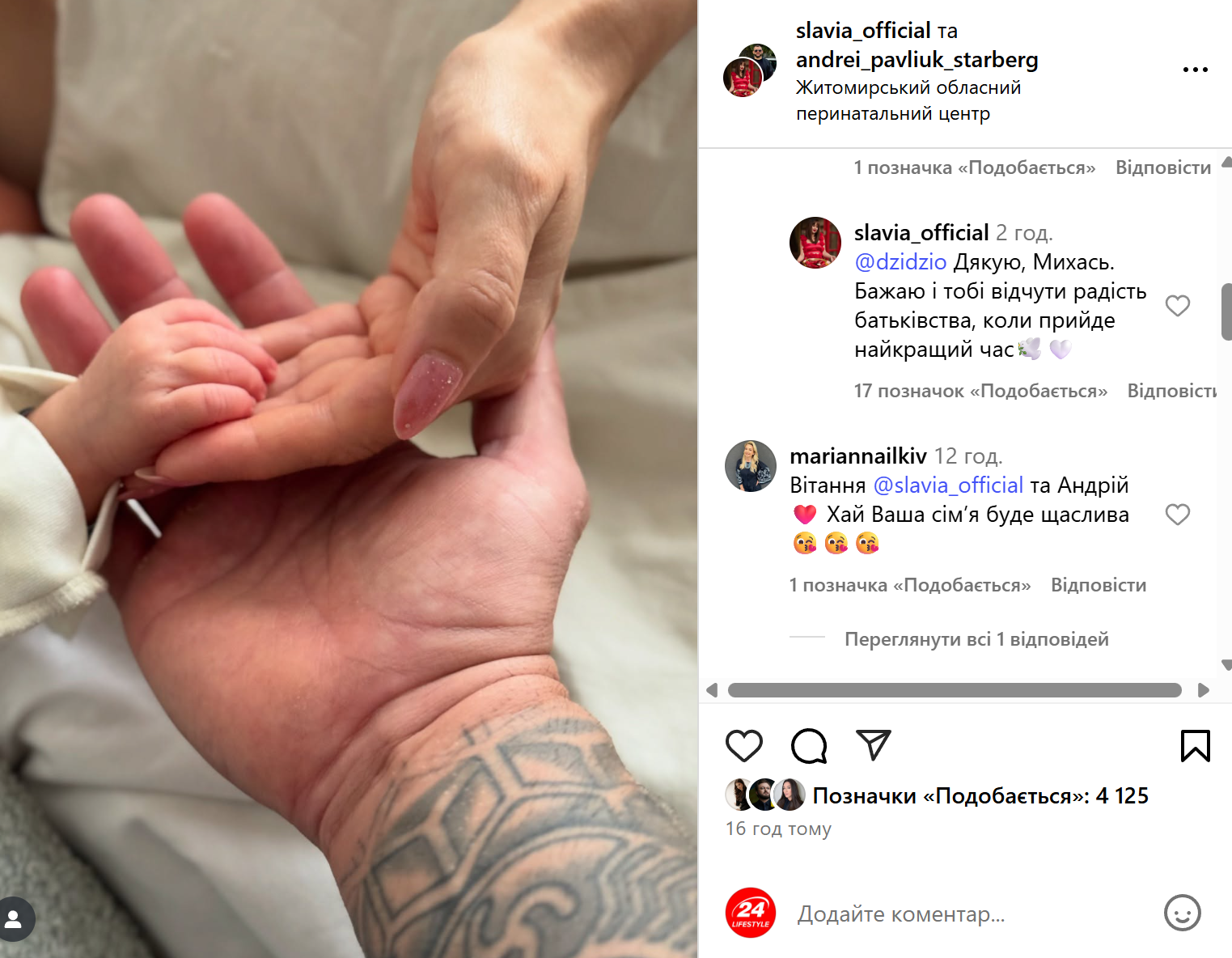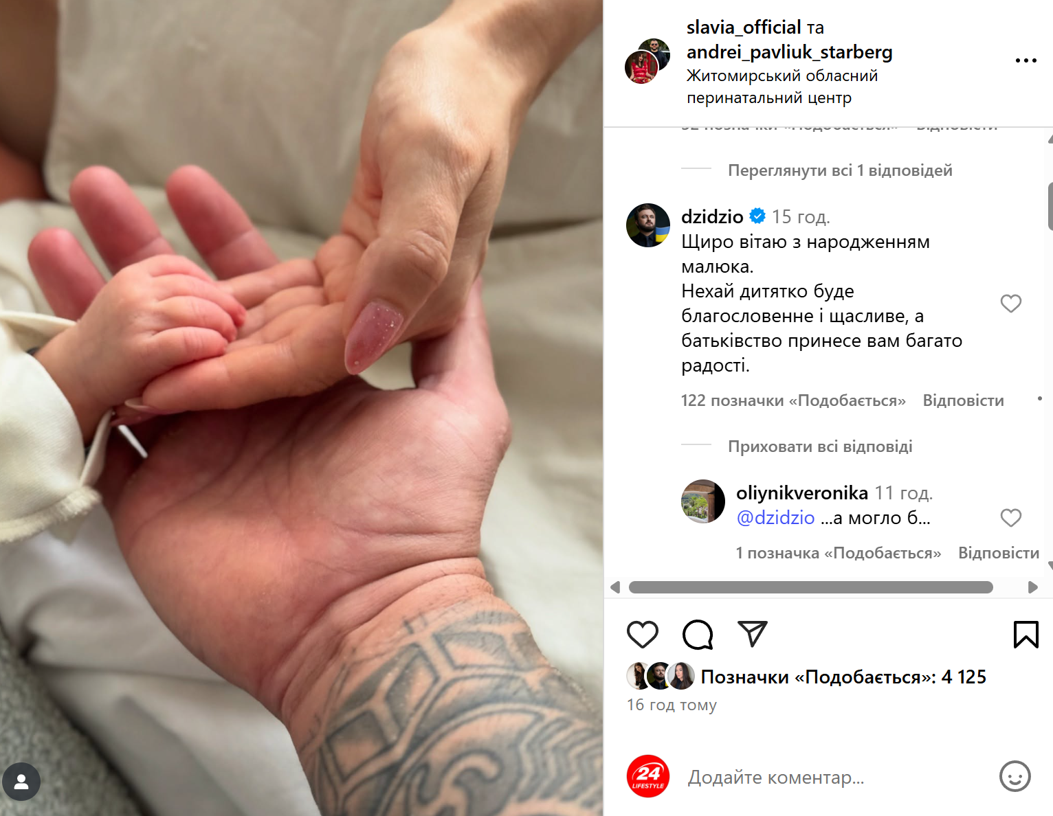 Так, SLAVIA опубликовала пост, где сообщила о рождении первенца. Дзидзьо оставил под публикацией комментарий.