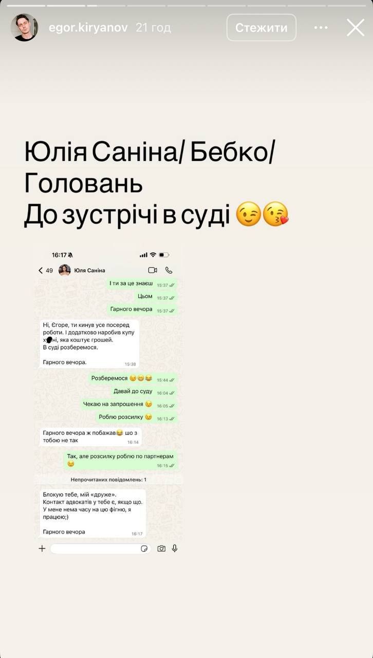 Об этом сообщает 24 Канал со ссылкой на инстаграм-страницу Кирьянова. Он показал переписку с фронтвумен группы The Hardkiss Юлией Саниной.