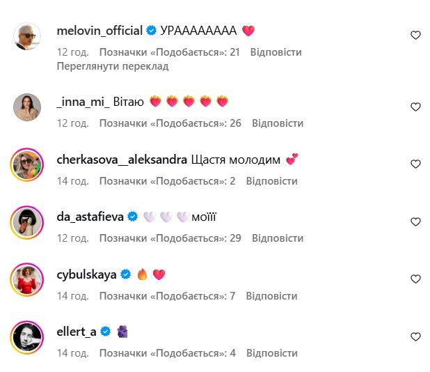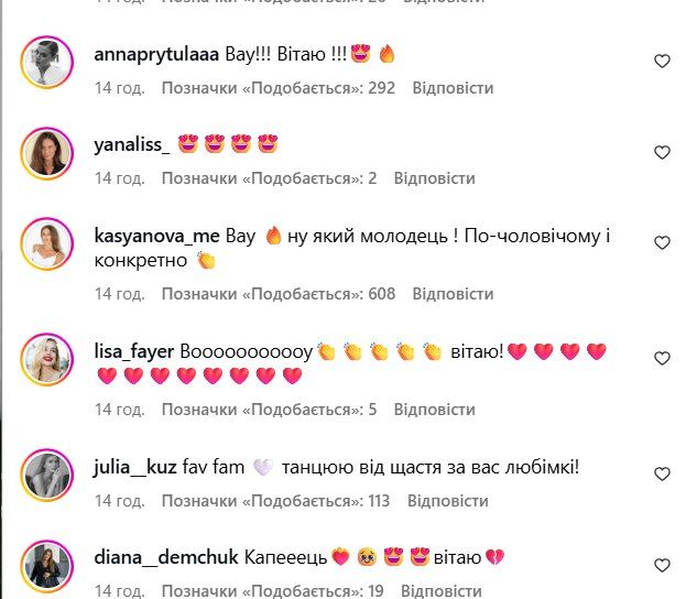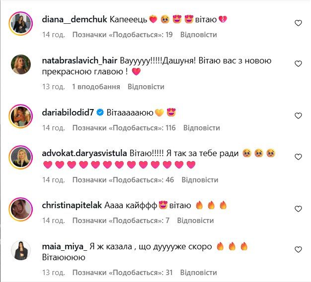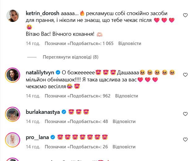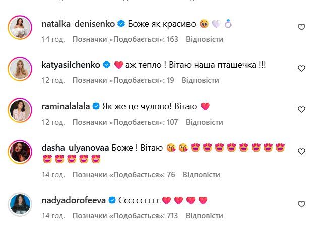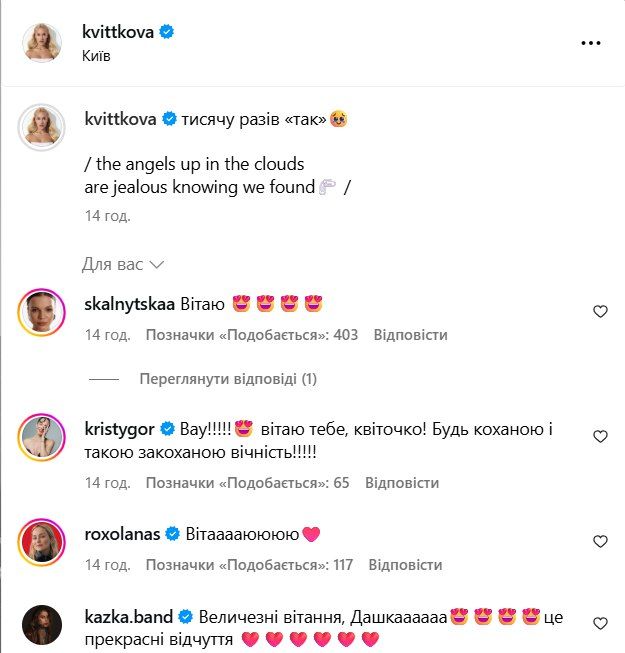 Квиткову с помолвкой уже поздравили блогер Анастасия Скальницкая, нотариус Кристина Горняк, которая является бывшей женой Владимира Остапчука, певицы ROXOLANA (Роксолана Сирота) и Надя Дорофеева, солистка группы KAZKA Александра Зарицкая, актриса Наталья Денисенко, дизайнер Екатерина Сильченко и другие.