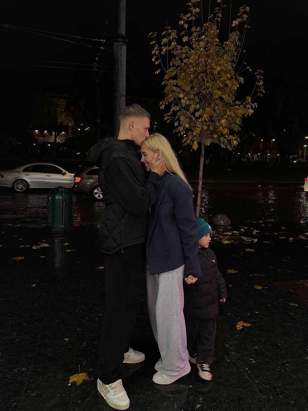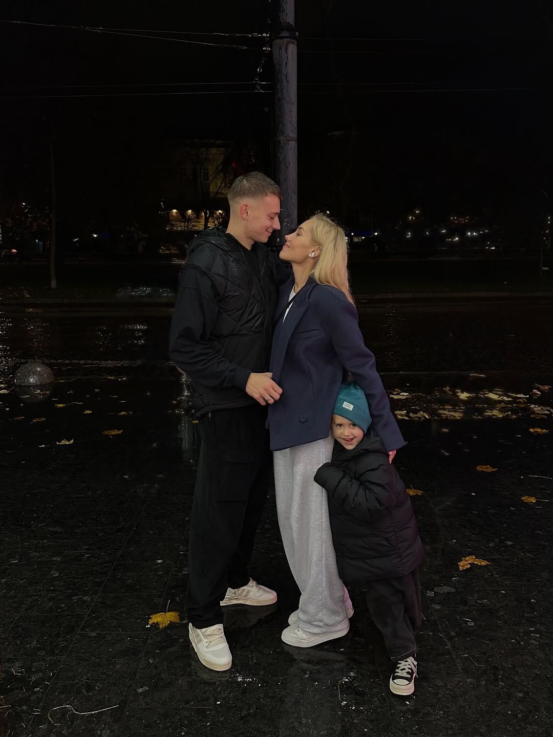 Дашу Квиткову, Владимира Бражка и Льва сфотографировали на одной из улиц Львова. На первом фото футболист нежно целует возлюбленную в лоб и обнимает ее. Рядом стоит сын блогерши, который держит маму за руку.