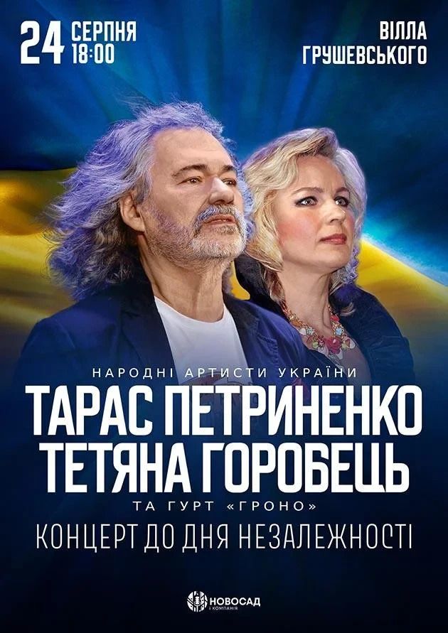 Легенда украинской музыки Тарас Петриненко и певица Татьяна Горобец приглашают на большой праздничный концерт с участием группы "Гроно". В программе концерта – известные хиты в дуэтном исполнении: "Украина", "Господи, помилуй нас", "Песня о песне" и другие глубокие композиции.