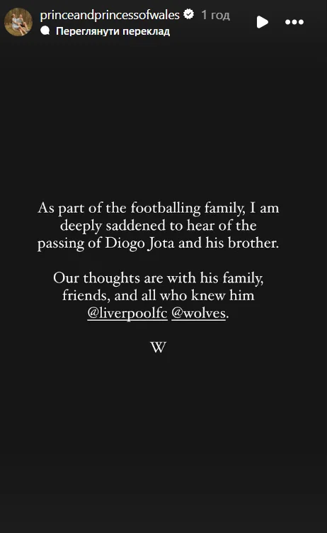 Уильям прокомментировал гибель футболистов на официальной инстаграм-странице принца и принцессы Уэльских. Наследник британского престола опубликовал сториз, где выразил соболезнования близким Диогу Жота.