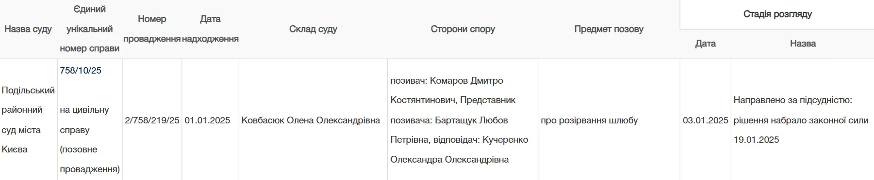 Согласно документам, инициатором развода стал Дмитрий Комаров. Он обратился с иском в Подольский районный суд Киева 1 января 2025 года.