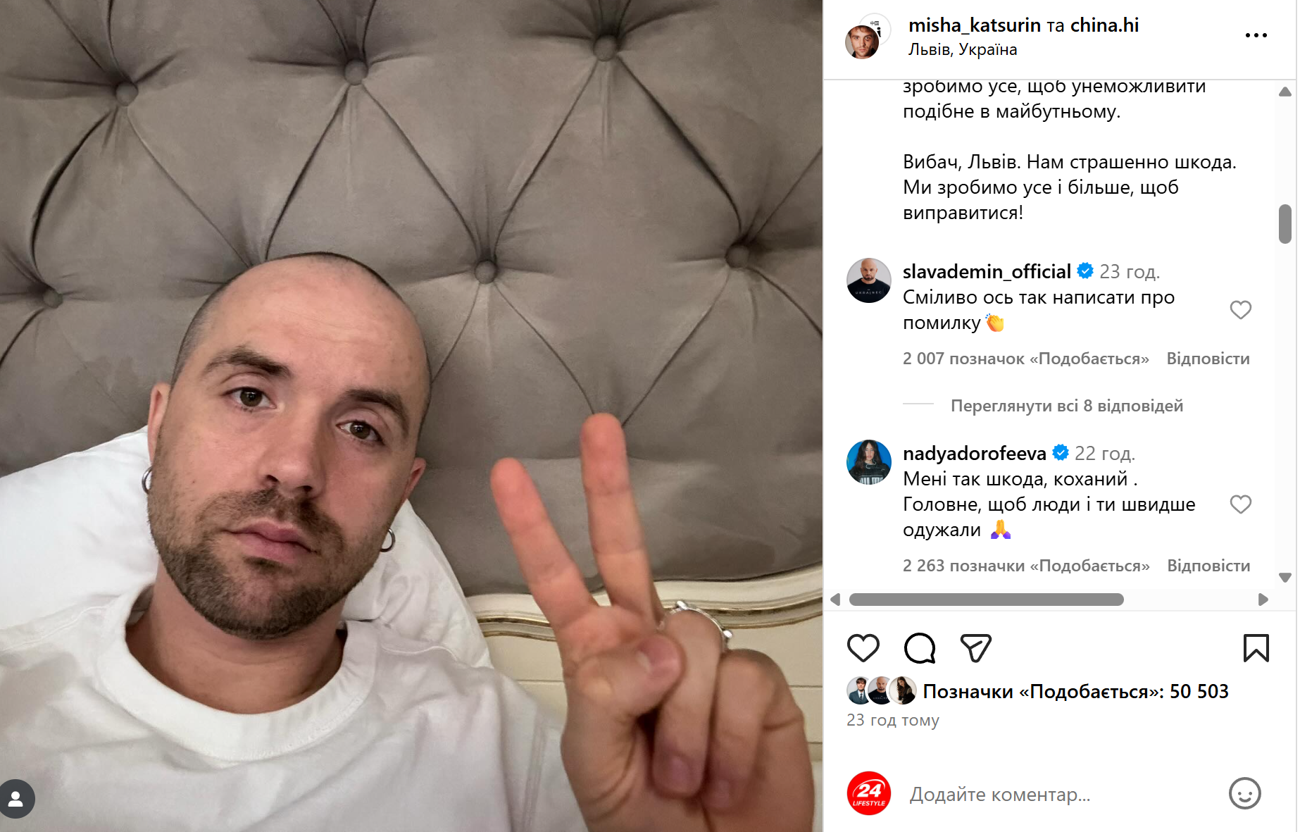 Под публикацией Кацурина артистка написала: "Мне так жаль, любимый. Главное, чтобы люди и ты быстрее выздоровели".
