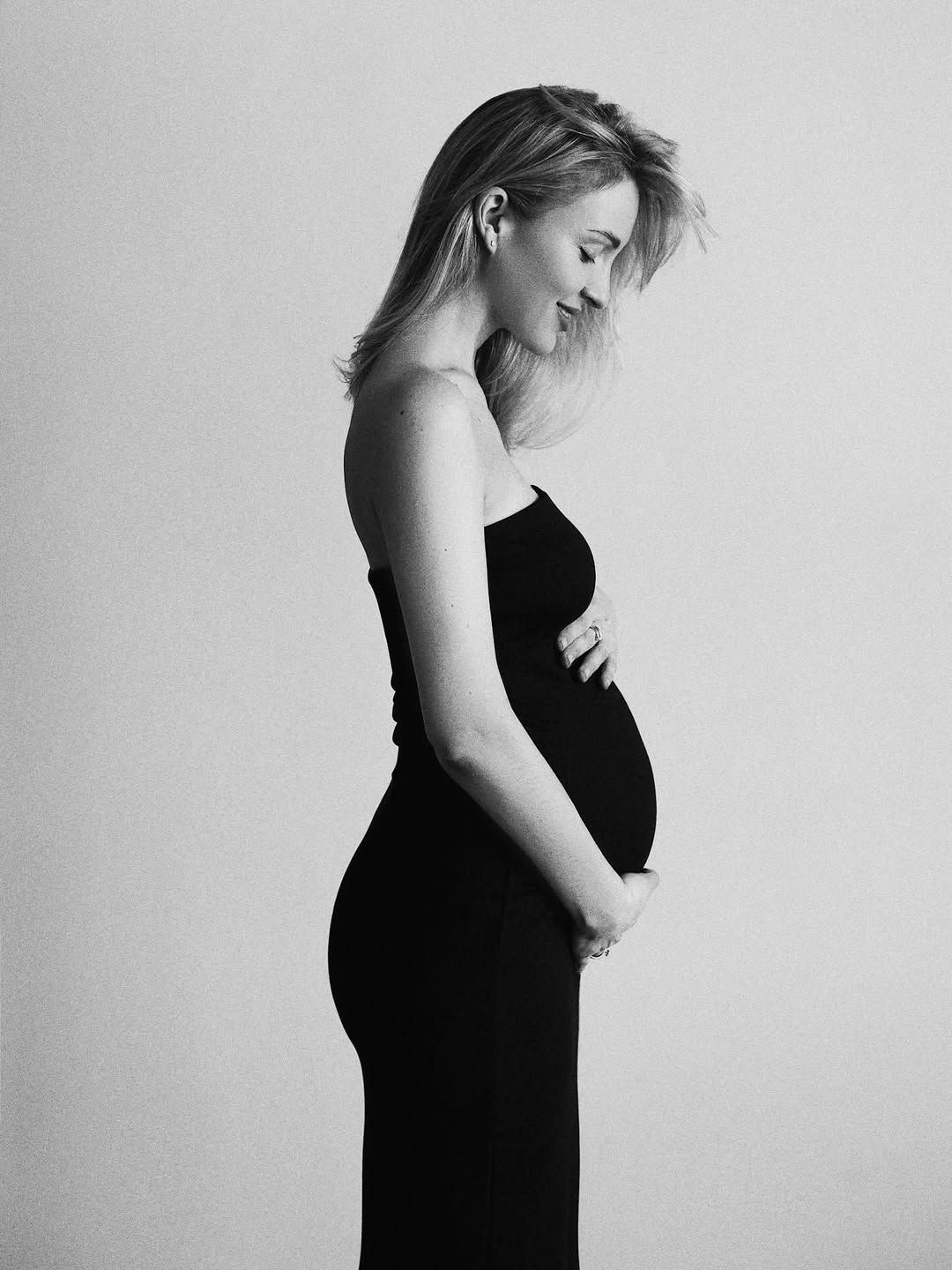 Екатерина Притула опубликовала черно-белое фото, на котором она позирует беременной. Женщина нежно держится за животик и улыбается. Она надела платье, а свой образ дополнила украшениями.