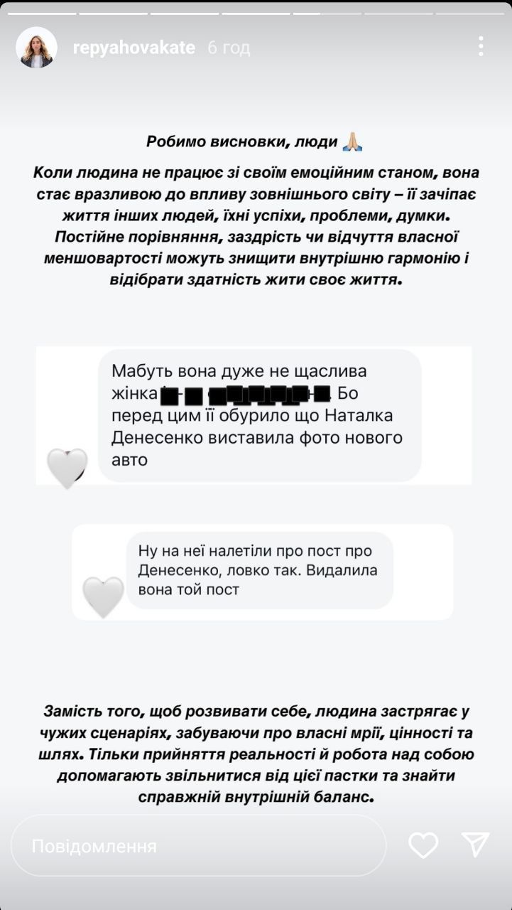 В инстаграм-сторис Екатерина Репяхова опубликовала скриншот сообщения Ларисы Созаевой. Она написала, что "подлетел интересный контент" от бывшей жены Виктора Павлика, и спросила у аудитории, соскучились ли по ней.