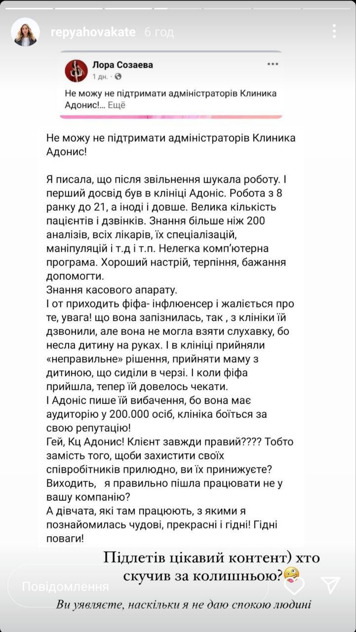 Экс-жена Павлика отметила, что в клинике попросили прощения у Репяховой, ведь та имеет большую аудиторию в социальных сетях, поэтому они боятся за свою репутацию. Женщина возмутилась, что заведение не защитило своих работников публично, и добавила, что девушки, которые там работают, "достойны уважения".