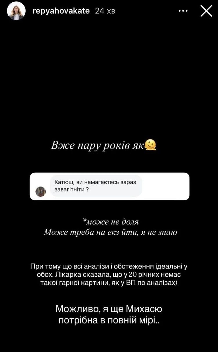 Может, не судьба. Может, надо на ЭКО идти, я не знаю. При том, что все анализы и обследовании идеальные у обоих. Врач сказала, что у 20-летних нет такой хорошей картинки, как у ВП (Виктор Павлик – 24 Канал) по анализам. Возможно, я еще Михасю нужна в полной мере,