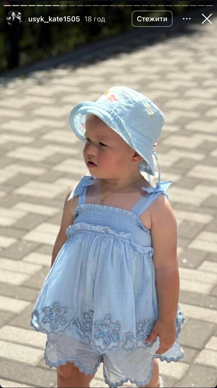 Екатерина Усик опубликовала фотографии, на которых маленькая Мария позирует на улице. Она одета в голубое летнее платье и шляпку в тон. На шее у девочки – крестик, а в ушах – серьги.