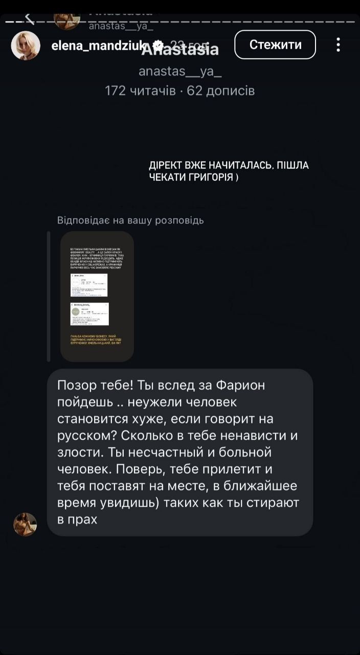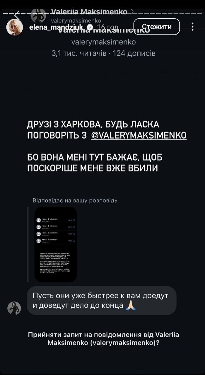 Елена Мандзюк получает угрозы / Скриншоты из инстаграма