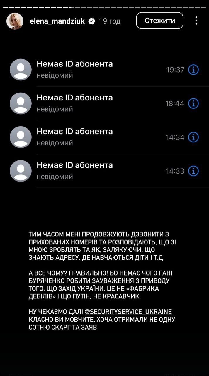Мандзюк также сообщила, что ей звонят со скрытых номеров и угрожают. Блогерша отмечает в сториз Службу безопасности Украины, чтобы там обратили внимание на Анну Алхим, пишет Show 24 со ссылкой на ее инстаграм.