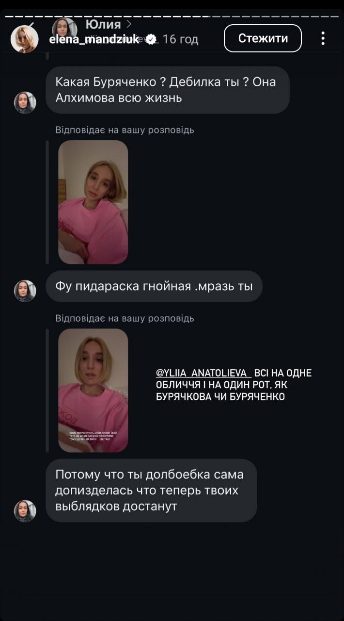 На скриншотах, которыми поделилась Елена Мандзюк, люди пишут ей оскорбительные слова, желают смерти, угрожают, в том числе и ее детям. По словам блогерши, это делают сторонники Анны Алхим.