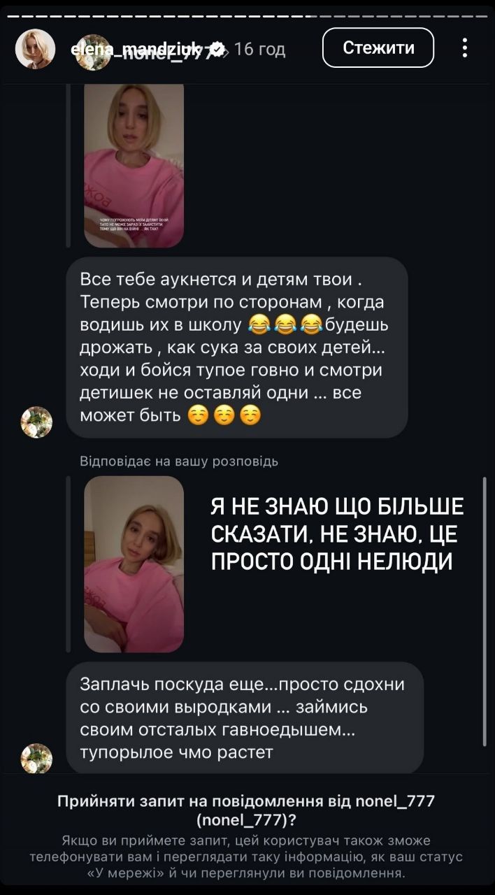 В одном из сториз Елена Мандзюк поделилась, что получила много угроз в директе и через звонки, а также – что ей присылали фотографии дома, где она проживает с детьми.