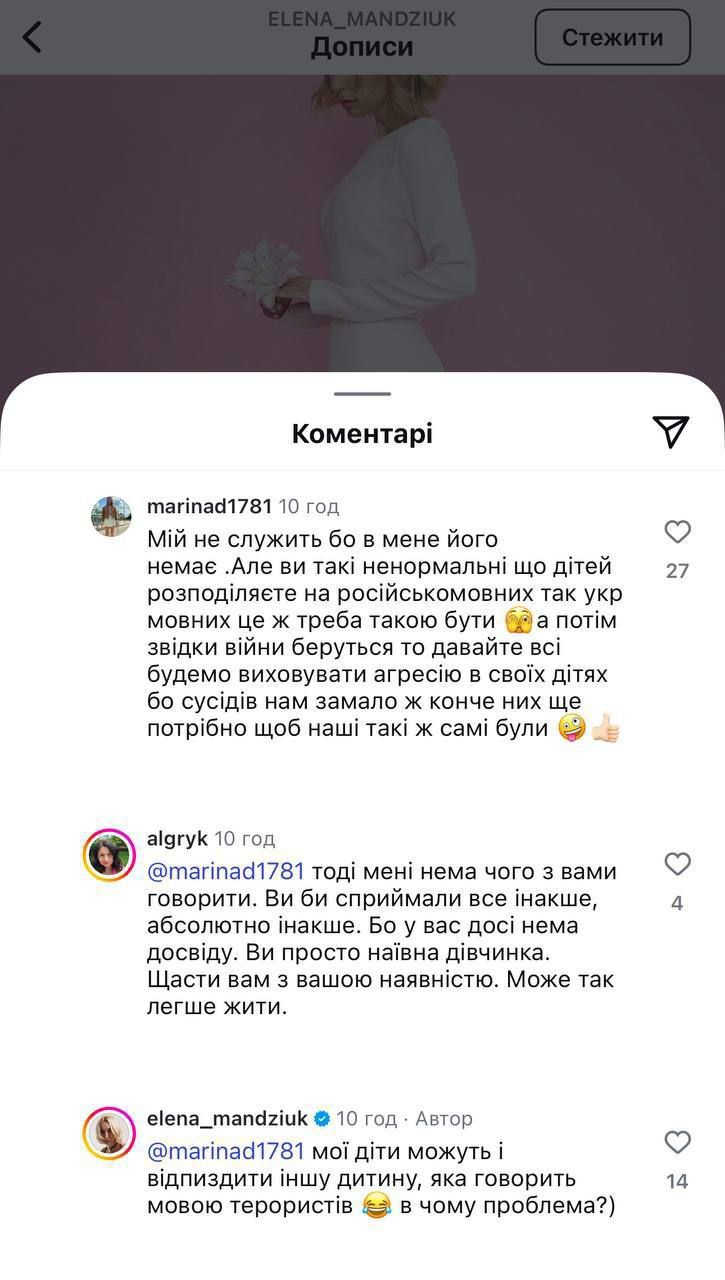 "А потом удивляются, откуда войны возникают. Давайте все будем воспитывать агрессию в детях, нам же мало соседей конч*ных. Давайте, чтобы наши были такими же", – говорилось в одном из комментариев. На него Елена Мандзюк резко ответила.