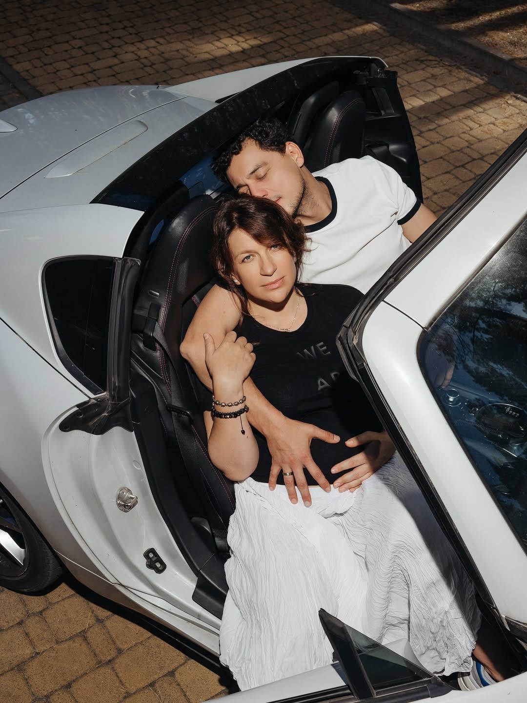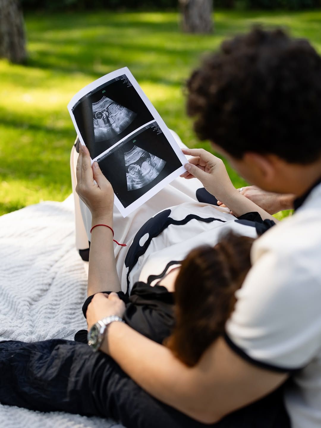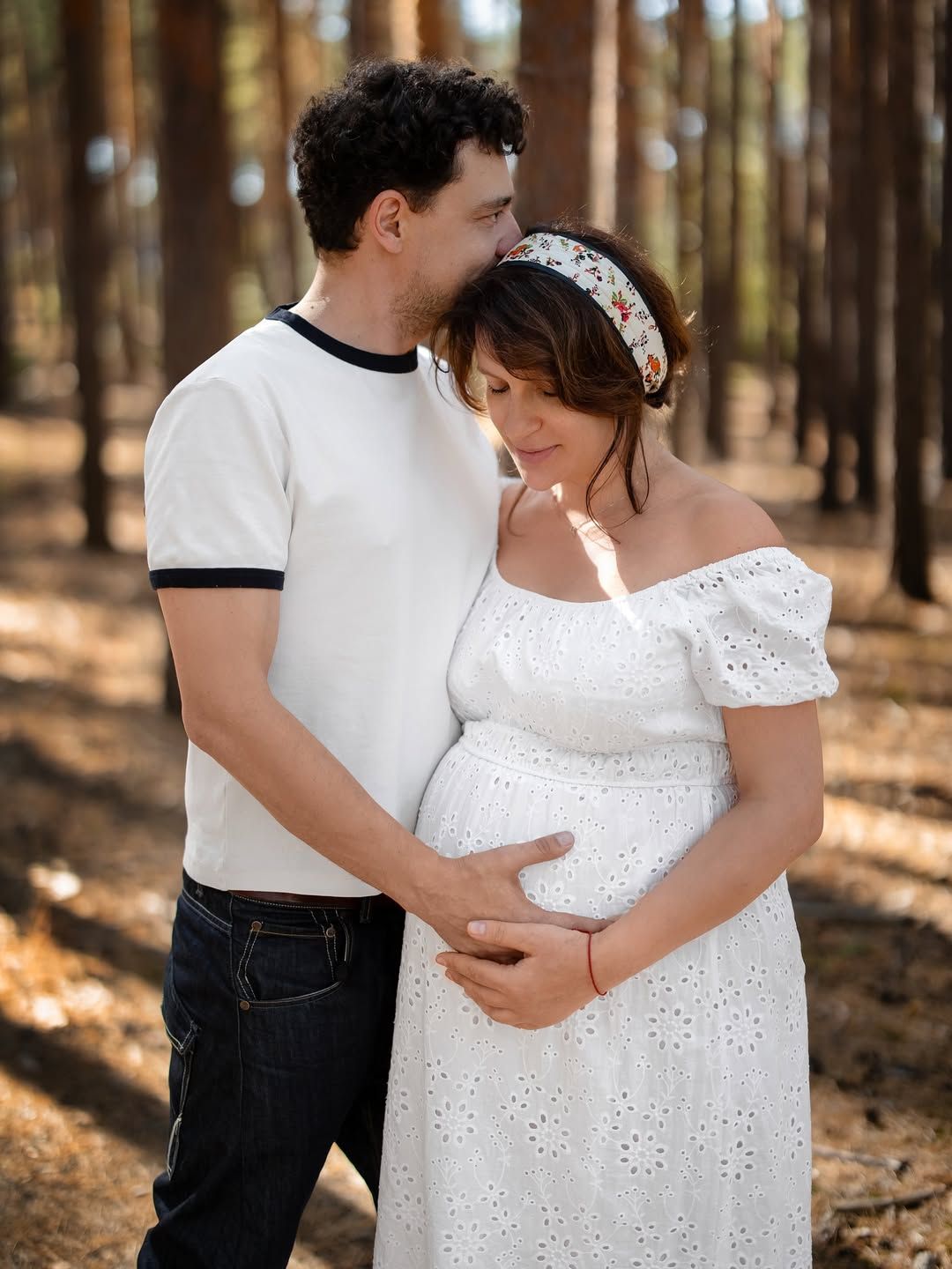 Евгений Синельников опубликовал серию фотографий, на которых позирует с беременной женой. Супруги устроили фотосессию на природе в городе Буча Киевской области. На одной из фотографий видно снимок УЗИ.
