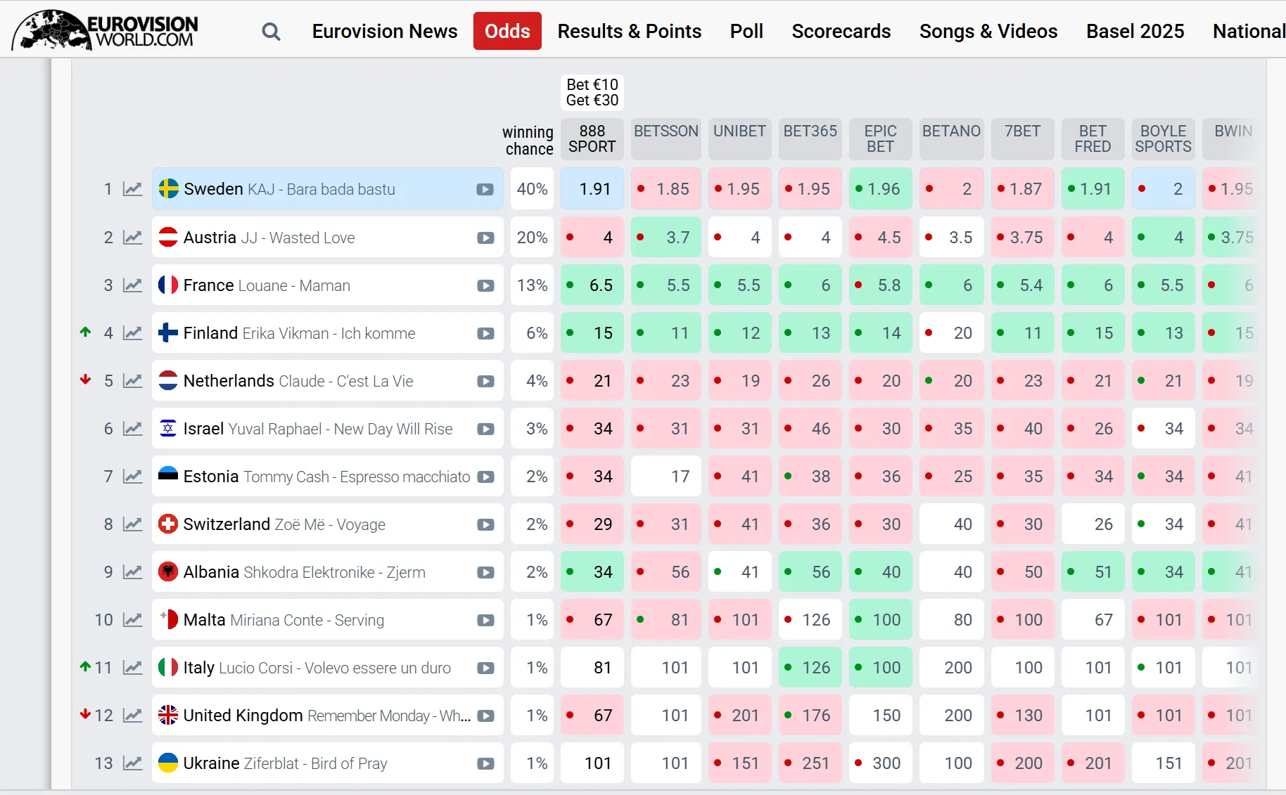 Украина сейчас находится на 13 строчке рейтинга с 1% шанса на победу.