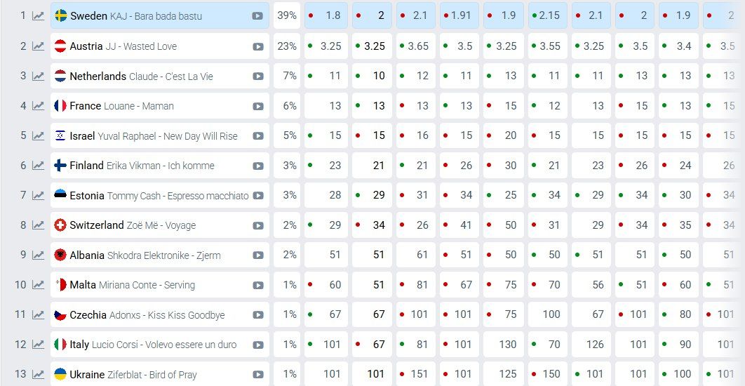 - Лидерами в прогнозах являются Швеция с шансом на победу 39%, Австрия с 23%, а также Нидерланды с 7%.