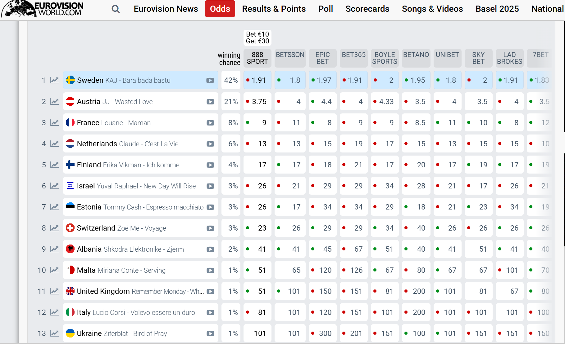 В десятку фаворитов также вошли Израиль, Эстония, Швейцария, Албания и Мальта. По прогнозам букмекеров, в Украине низкие шансы на победу, хотя они выросли после выступления в полуфинале. Сейчас группе Ziferblat пророчат 13 место.