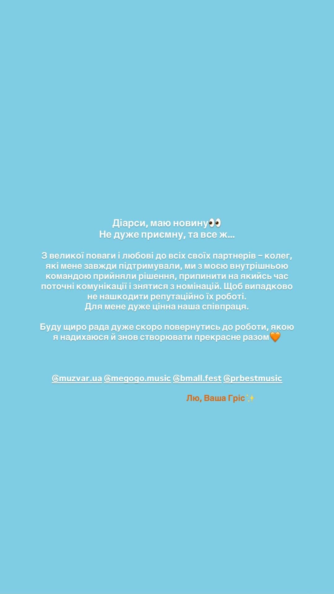 Однако волна критики не прекратилась, а вопросы к певице остались. На этом фоне GRISANA объявила, что снимается с номинаций, чтобы не навредить репутационно премиям. Также артистка прекращает текущие коммуникации.