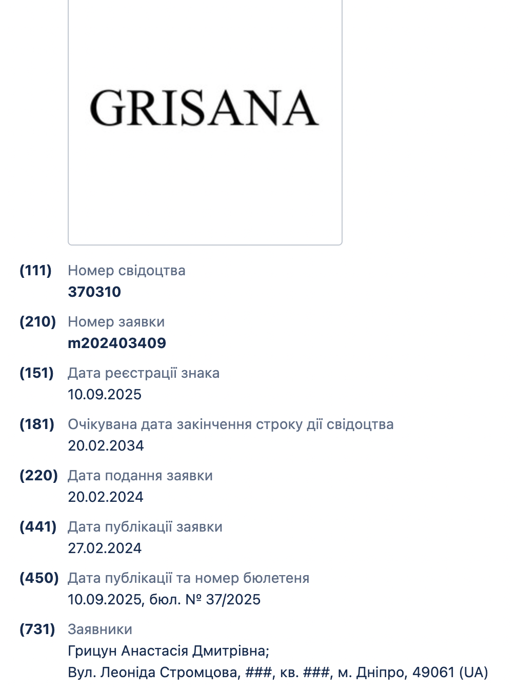 Также аноним упомянул о гостинице в Павлограде, принадлежащей GRISANA. И действительно, совладелицей отеля "Крокус" и основательницей торговой марки GRISANA является человек с одинаковым именем, фамилией и пропиской – Грицун Анастасия Дмитриевна из Днепра.