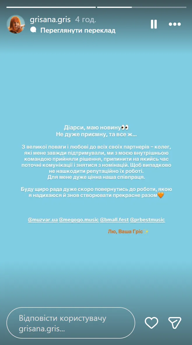 На фоне этого инцидента артистка временно прекращает публичные коммуникации и снимает свою кандидатуру со всех номинаций. Пишет 24 Канал со ссылкой на инстаграм-страницу GRISANA.