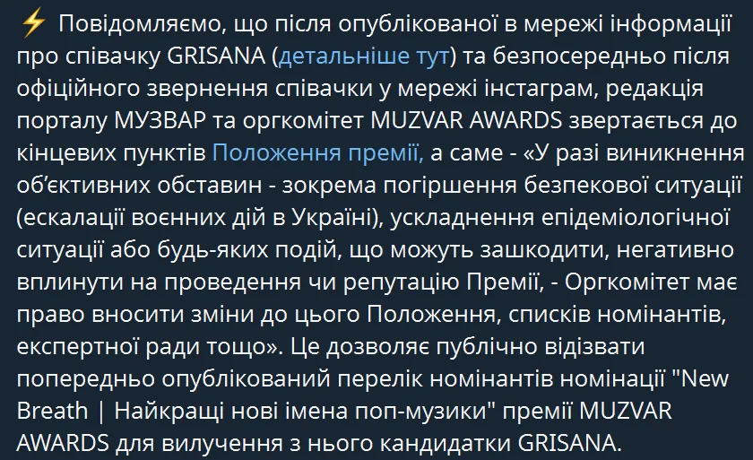 GRISANA не будет участвовать в премии MUZVAR / Скриншот из телеграма