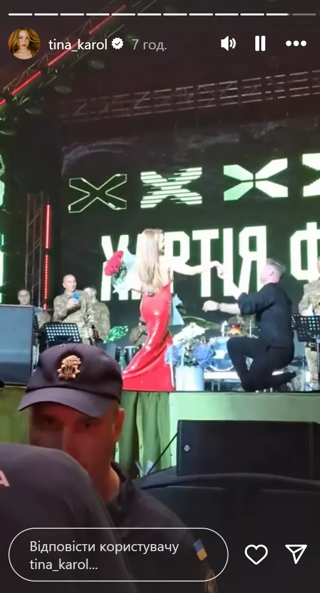 Еще одной неожиданностью стало выступление Тины Кароль с военным оркестром НГУ. Артистка была "сикрет гостем" фестиваля, поэтому ее не было среди хедлайнеров. После концерта Сергей Ждана вышел на сцену к Тине и подарил ей красивый букет цветов и даже стал на одно колено.