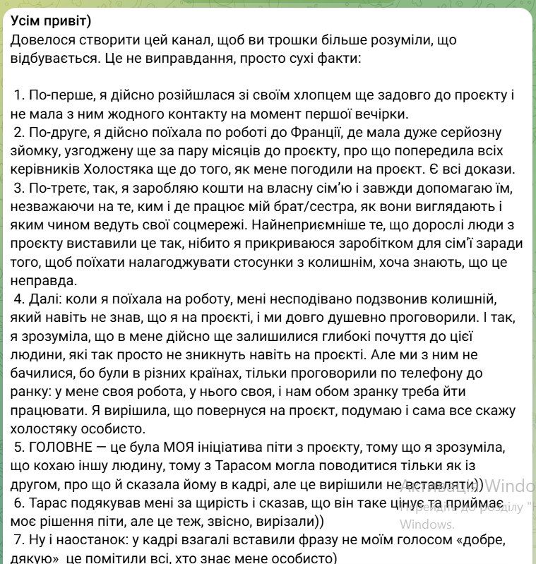 Девушка считала, что отношения окончательно завершились. Однако поделилась с Цимбалюком, что когда пришла на проект, бывший парень начал ее искать и пытался связаться.