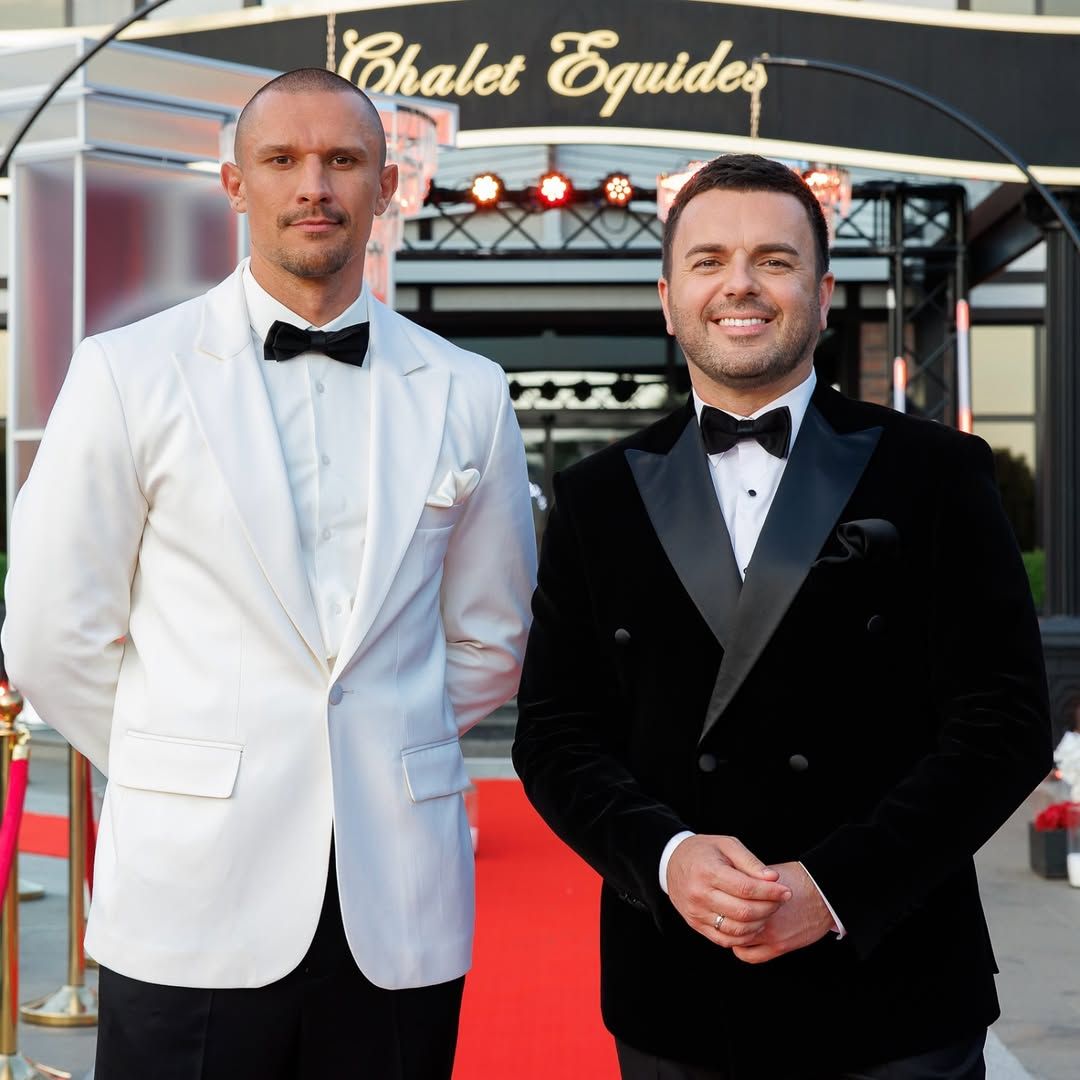 Тарас Цимбалюк предстал в стильном деловом образе: он выбрал костюм, состоящий из черных брюк и белоснежной рубашки и жакета, дополненный черной бабочкой на шее. Рядом позировал неизменный телеведущий шоу, Григорий Решетник.