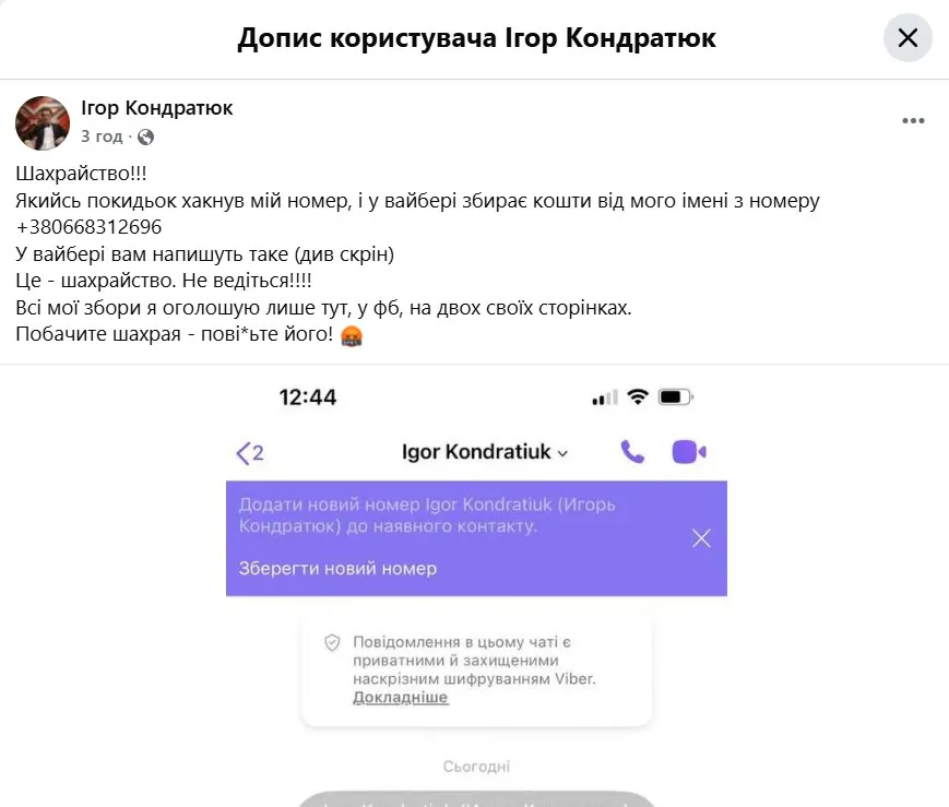 Игорь Кондратюк сообщил о мошенниках / Скриншот из фейсбука