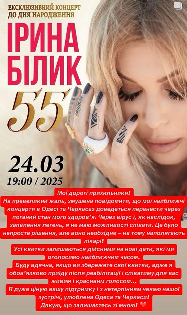 - Ирина Билык сообщила о переносе концертов в Одессе и Черкассах из-за воспаления легких.