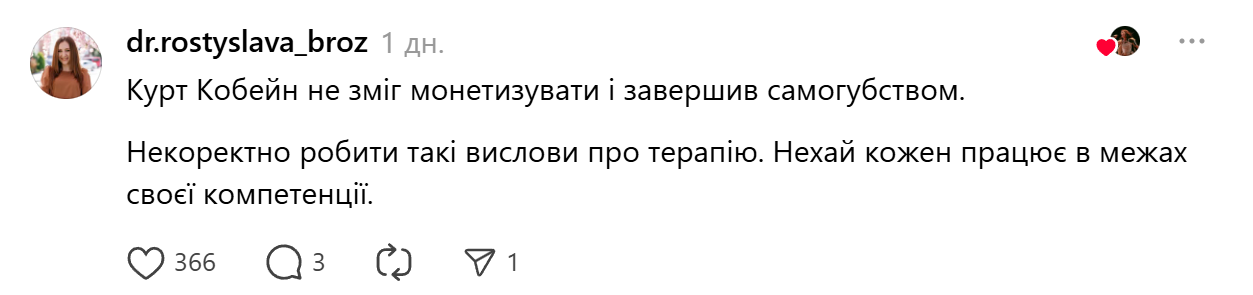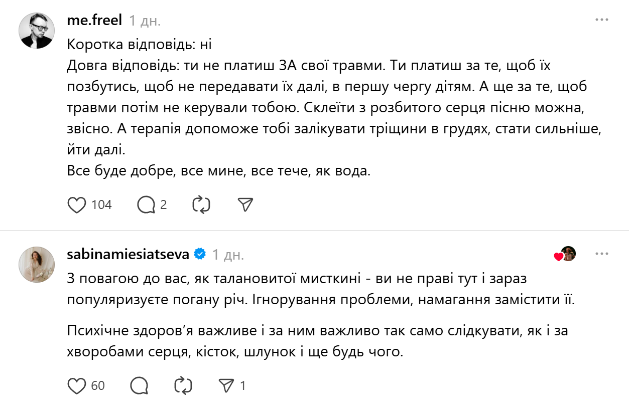 Такое сравнение пользователи назвали некорректным и даже опасным, ведь оно преуменьшает важность психического здоровья. Люди отметили: психотерапия нужна не для того, чтобы "платить за травмы", а чтобы научиться их проживать, не переносить на других (в частности детей), а также не позволять прошлому управлять жизнью.