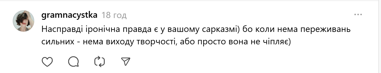 Впрочем, были и те, кто поддержал позицию Jerry Heil. Сторонники отмечали, что ее пост – это своеобразный сарказм, в котором есть доля правды: сильные переживания действительно часто становятся основой для творчества.