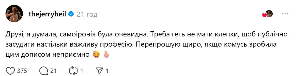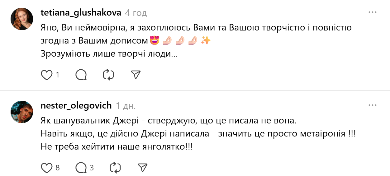 После волны критики Яна извинилась перед фанами и объяснила, что именно имела в виду. Сообщает Show 24 со ссылкой на страницу Jerry Heil в Threads.