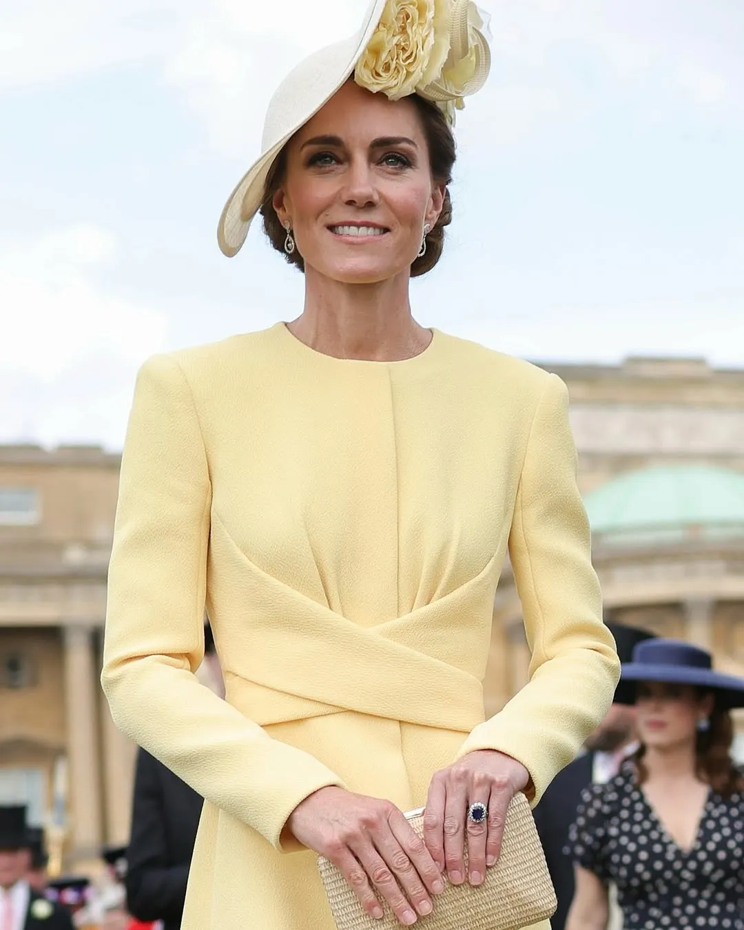 43-летняя принцесса Кейт и 42-летний принц Уильям прогуливались среди гостей на лужайке в изысканных образах. Принц Уэльский выбрал элегантный костюм и цилиндр. Кейт Миддлтон предстала в масляно-желтом платье от Emilia Wickstead и шляпке Philip Treacy.