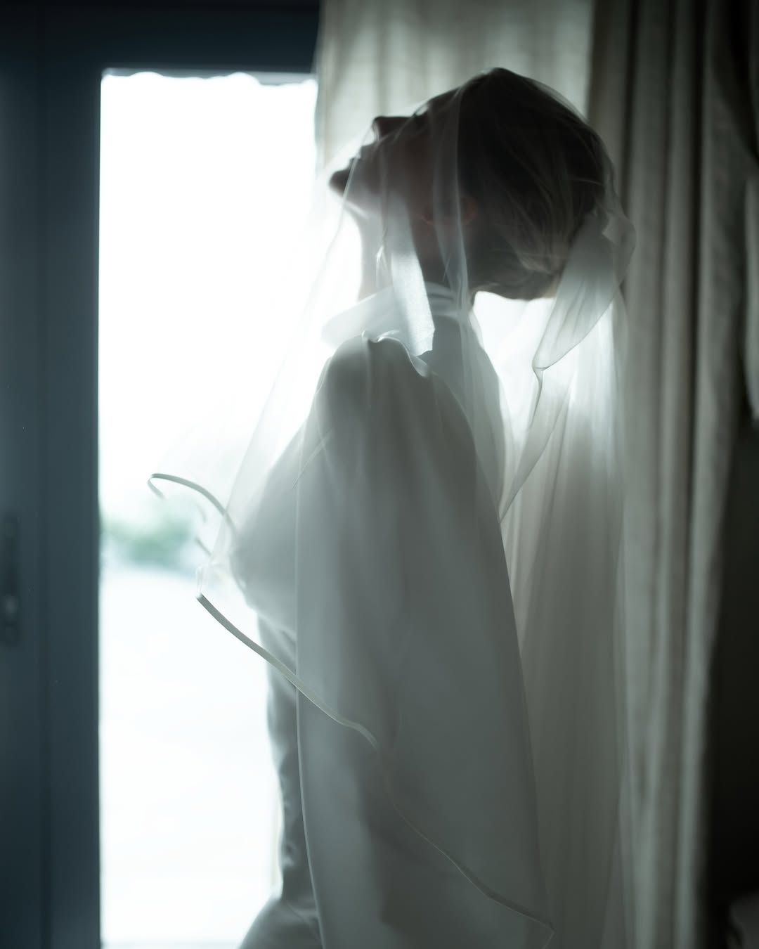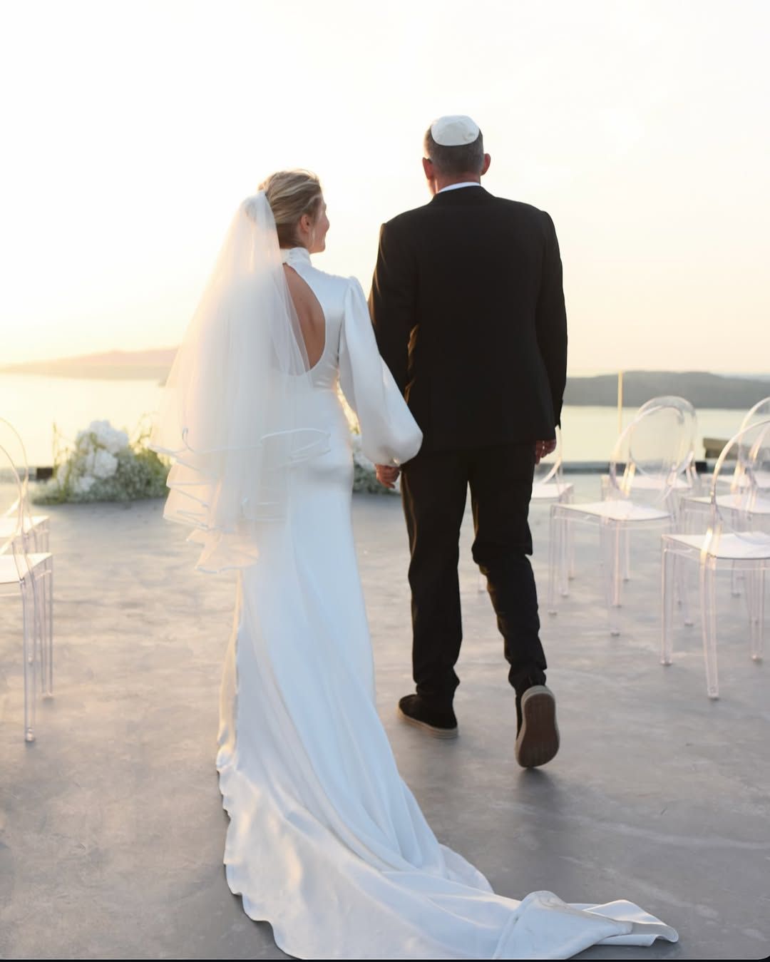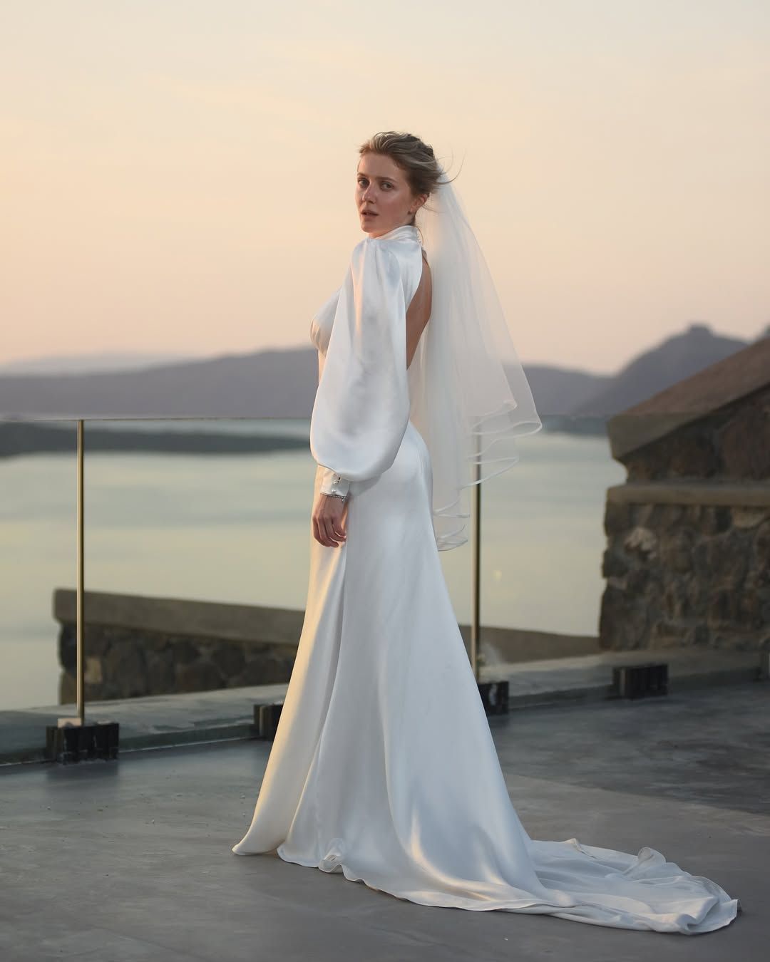 Свадьба артистки состоялась в Праге два года назад. Образ невесты состоял из белоснежного атласного платья с длинным шлейфом, объемными рукавами, открытой спиной, воротничком-стойкой и фаты. Волосы были уложены в лаконичный пучок. Жених взамен выбрал темный костюм.