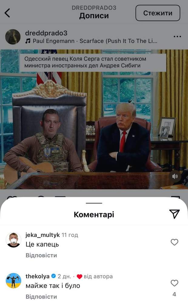 Так, певец сделал в инстаграм-сторис репост мема, где он сидит с гитарой в кресле в помещении, похожем на офис. Рядом с ним был изображен Дональд Трамп, а фотография сопровождалась подписью: "Одесский певец Коля Серга стал советником министра иностранных дел Андрея Сибиги".