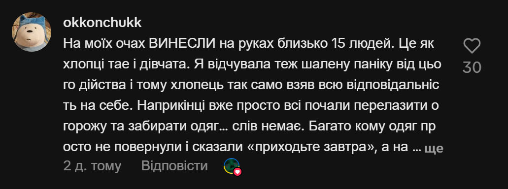 - "На моих глазах вынесли на руках около 15 человек. Это были как парни, так и девушки. Я чувствовала тоже бешеную панику от этого действа... В конце все просто начали перелазить ограждение и забирать одежду... Многим одежду просто не вернули и сказали "приходите завтра"".