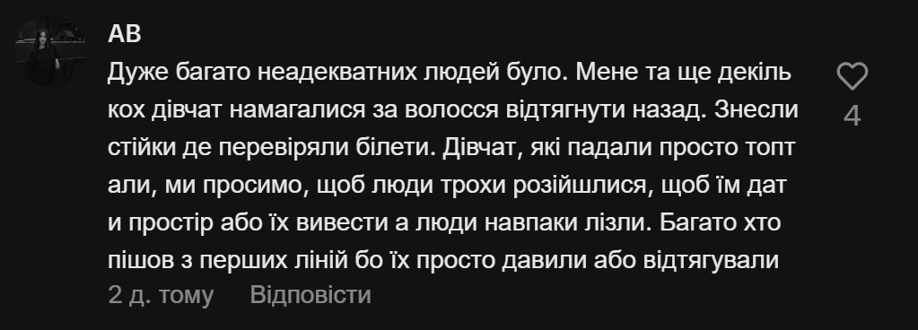 - "Очень много неадекватных людей было. Меня и еще нескольких девушек пытались за волосы оттащить назад. Снесли стойки, где проверяли билеты. Девушек, которые падали, просто топтали. Мы просили, чтобы люди немного разошлись, чтобы им дать пространство, чтобы их вывести, а люди наоборот лезли. Многие ушли с первых линии, потому что их просто давили или оттягивали".