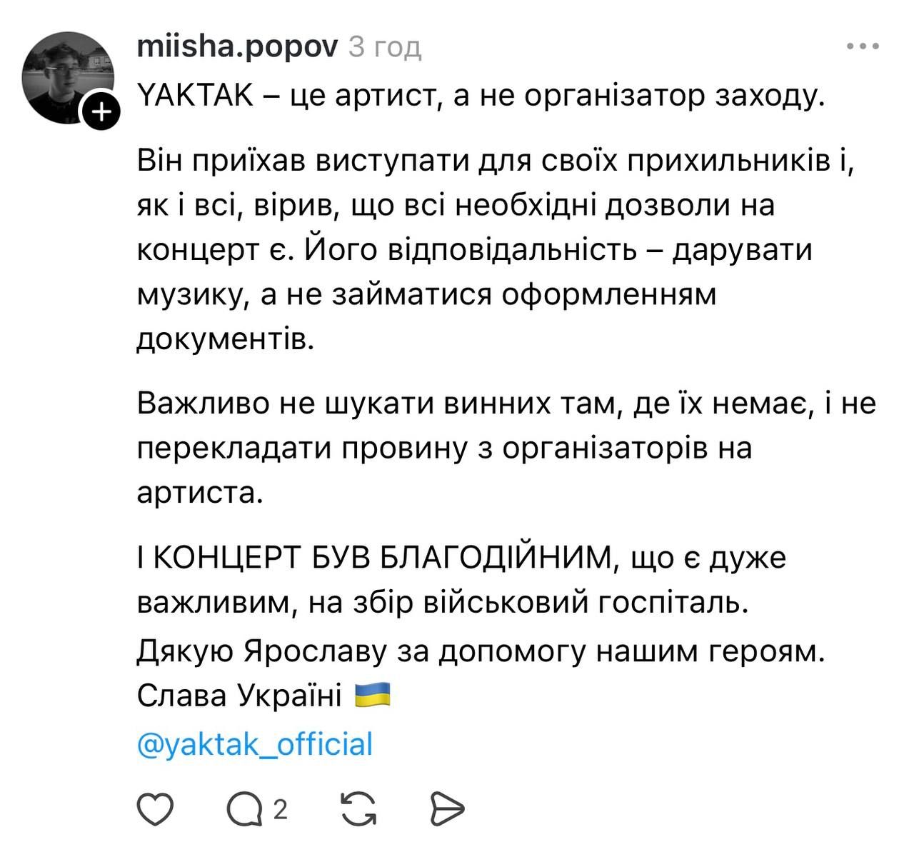 - "YAKTAK – это артист, а не организатор мероприятия. Он приехал выступать для своих сторонников и, как и все, верил, что все необходимые разрешения на концерт есть. Его ответственность – дарить музыку, а не заниматься оформлением документов. Важно не искать виновных там, где их нет, и не перекладывать вину с организаторов на артиста".