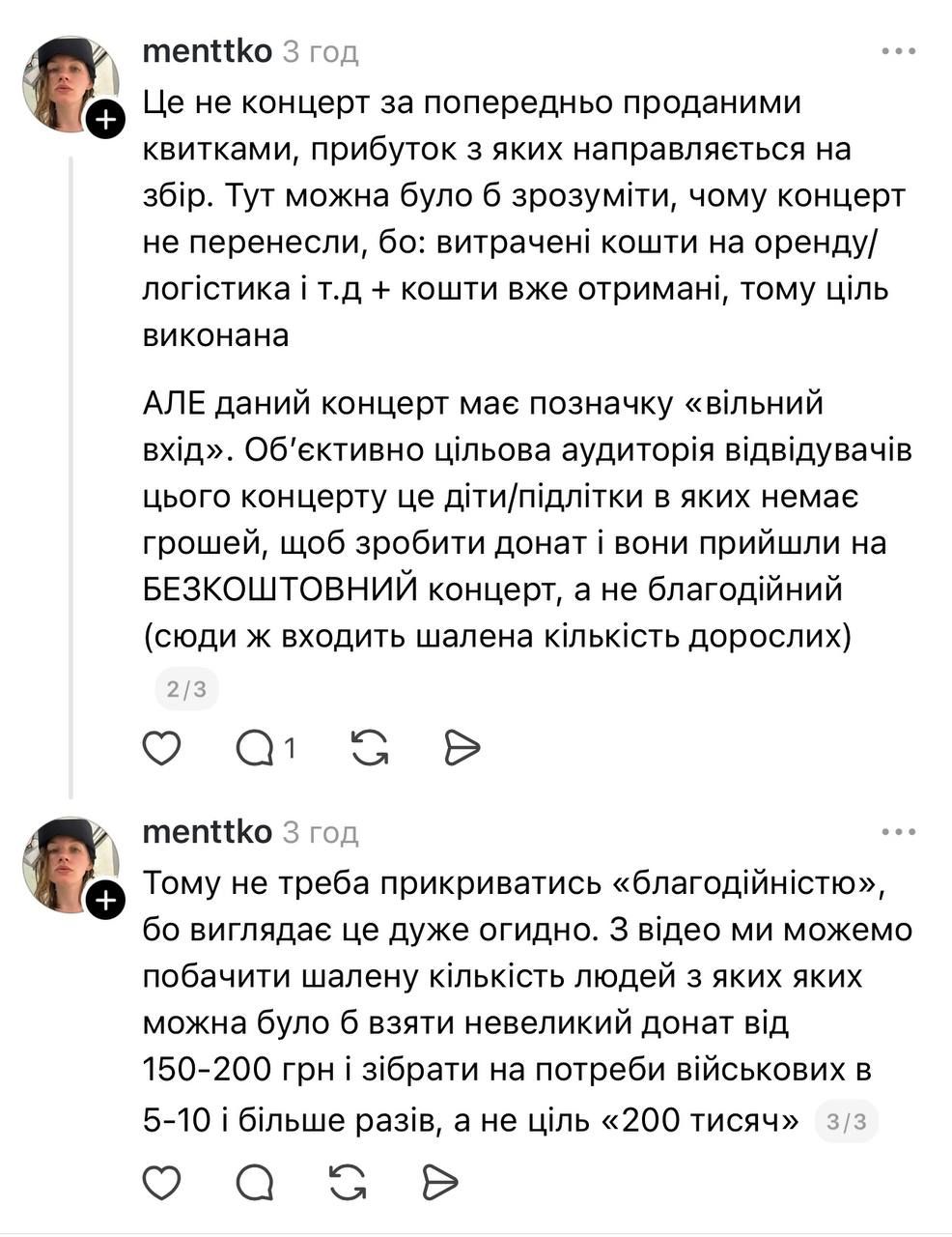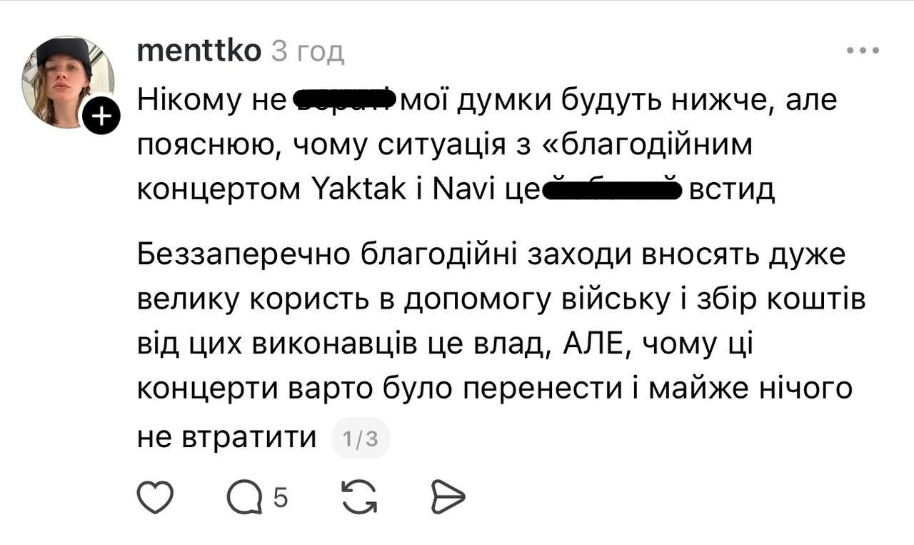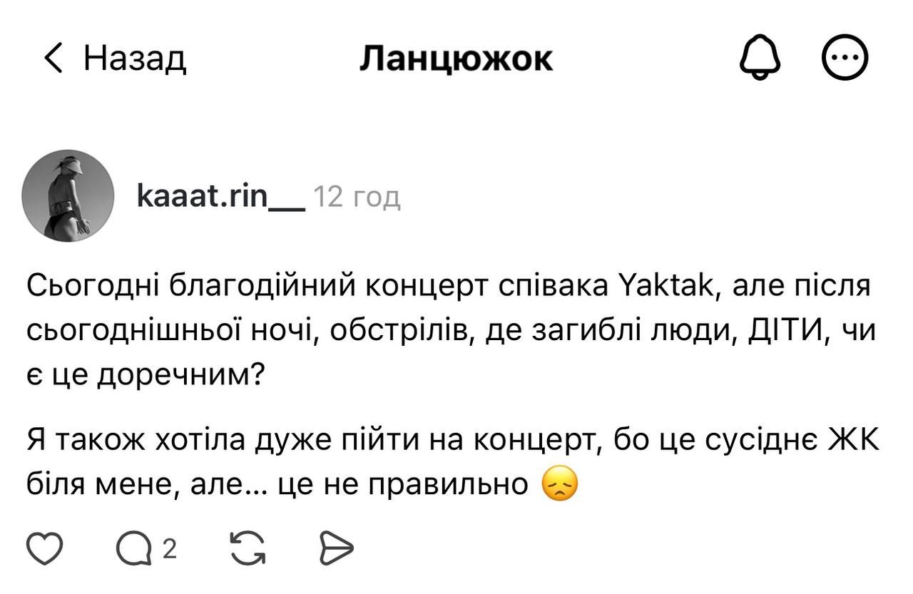 - "Сегодня благотворительный концерт певца YAKTAK, но после сегодняшней ночи, обстрелов, где погибшие люди, дети, является ли это уместным? Я также хотела пойти на концерт, потому что это соседнее ЖК, но это неправильно".