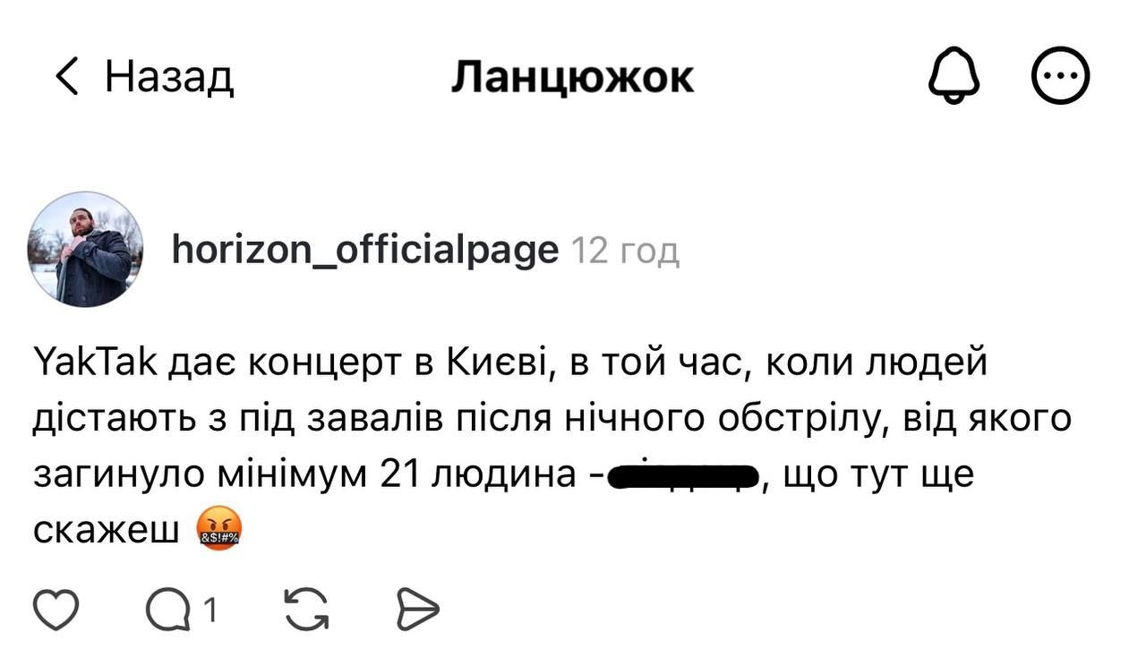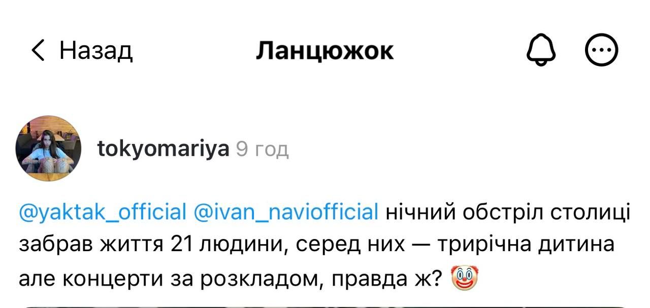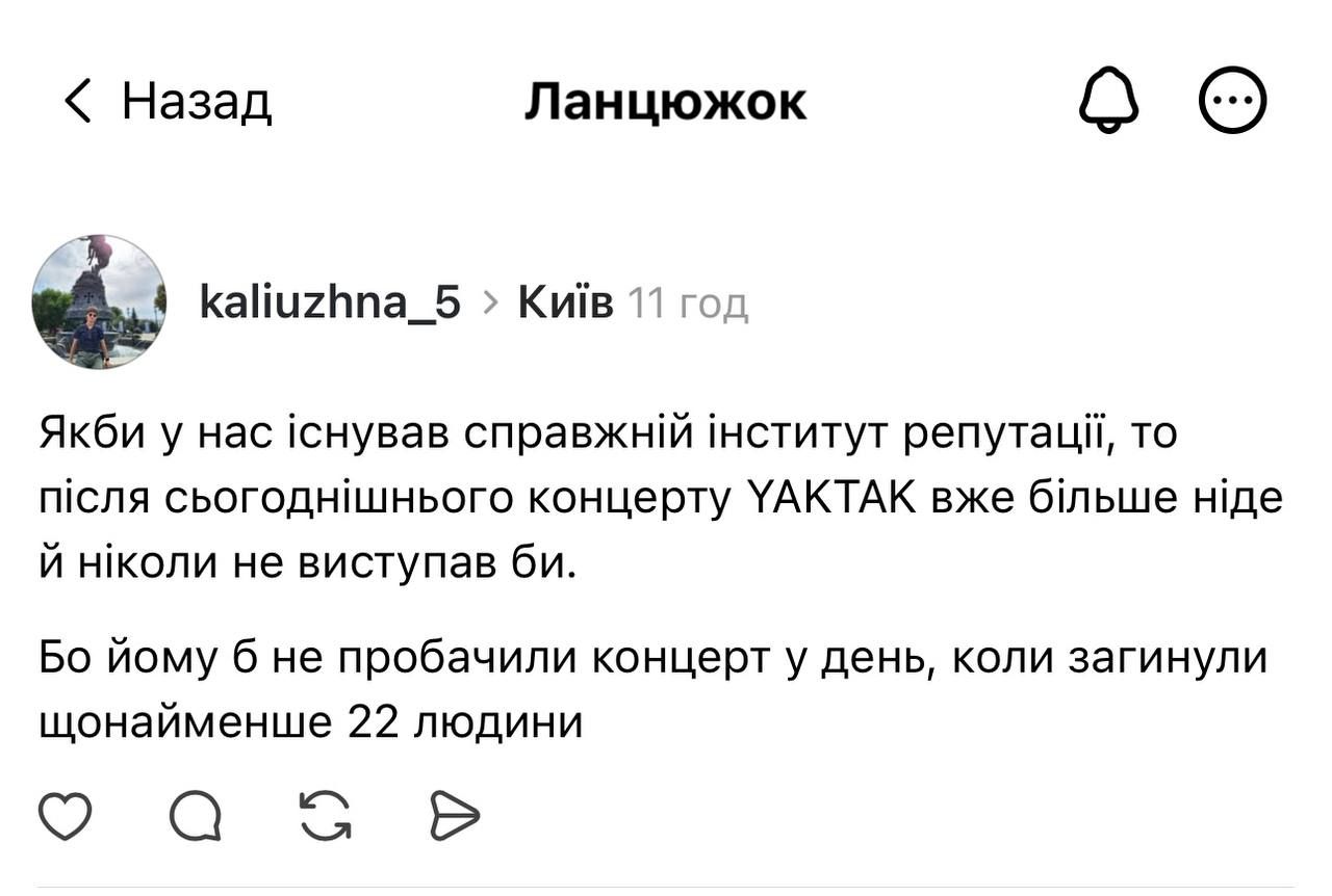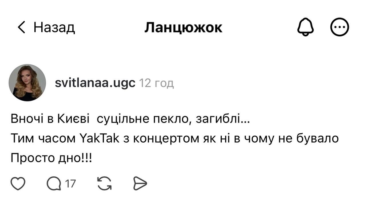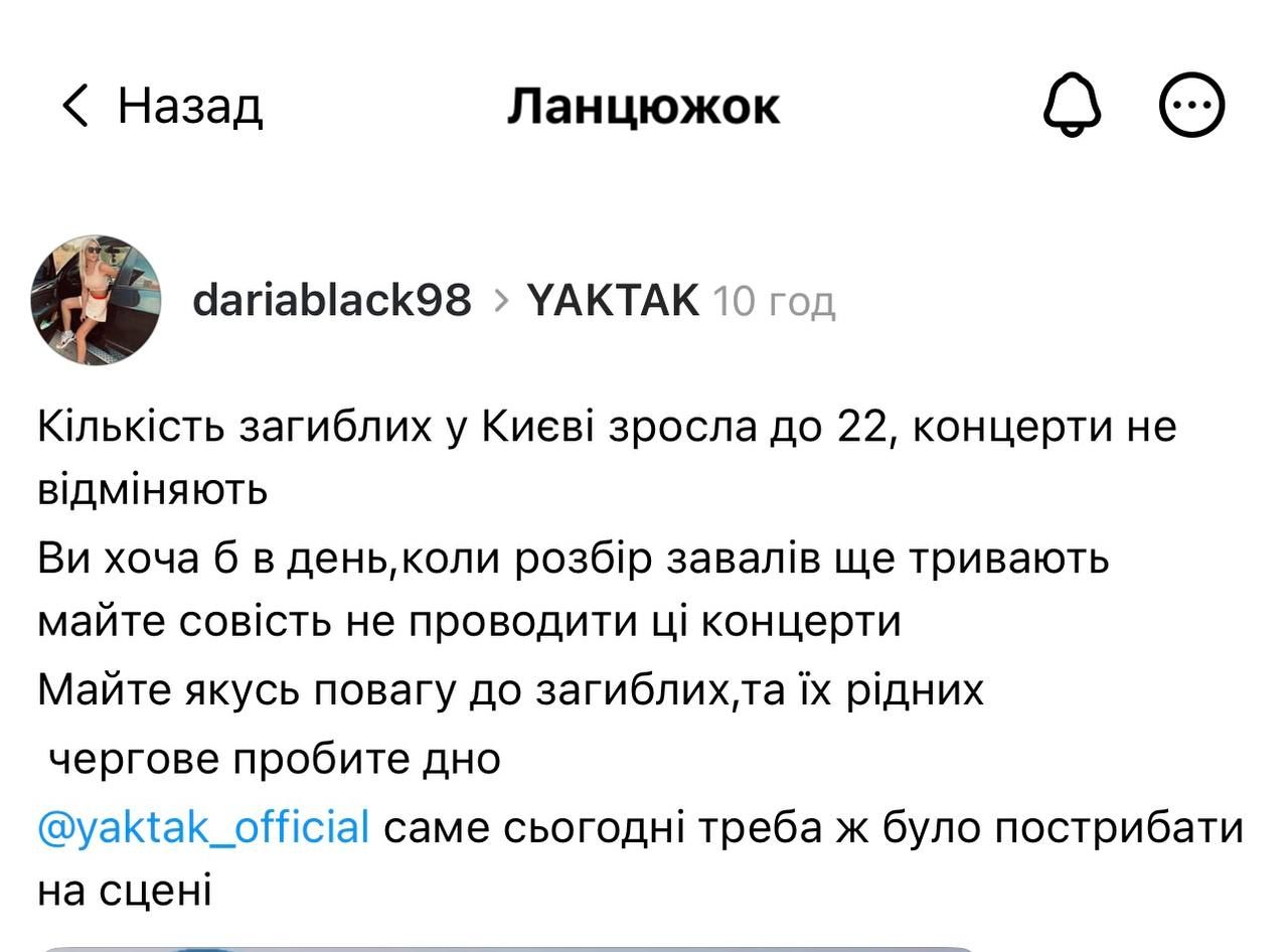 - "Ночью в Киеве сплошной ад, погибшие. Тем временем YAKTAK с концертом, как будто ничего не произошло. Просто дно!"