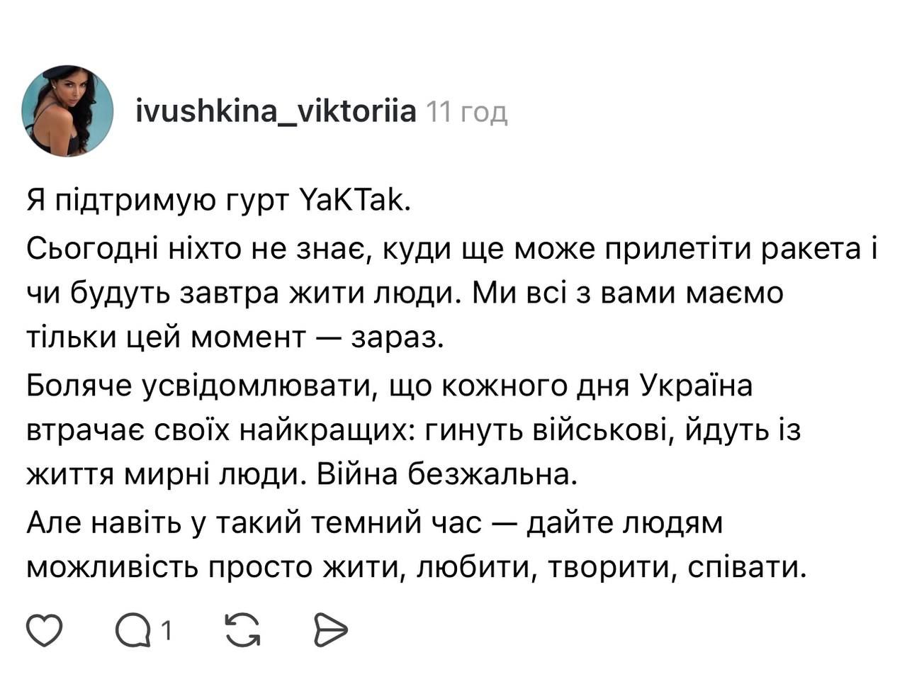 - "Сегодня никто не знает, куда еще может прилететь ракета и будут ли завтра жить люди. Мы все с вами имеем только этот момент – сейчас. Больно осознавать, что каждый день Украина теряет своих лучших: гибнут военные, уходят из жизни мирные люди. Война безжалостна. Но даже в такое темное время дайте людям возможность просто жить, любить, творить, петь".
